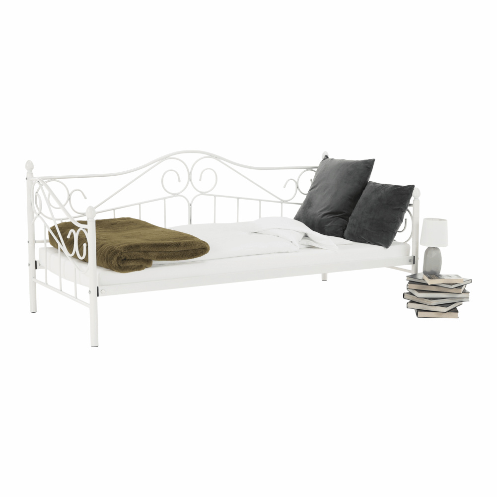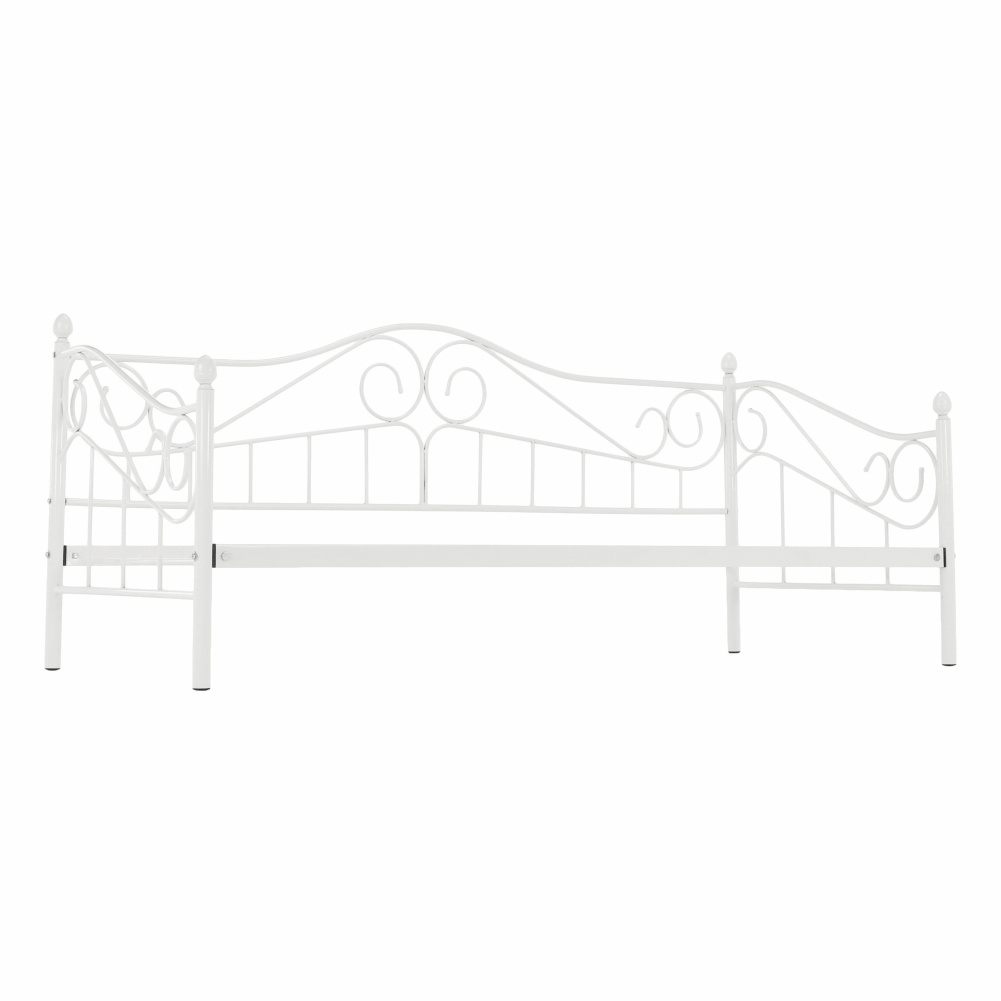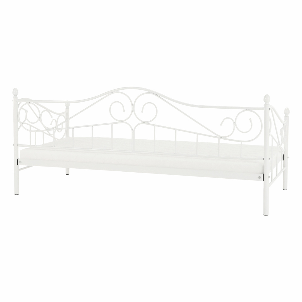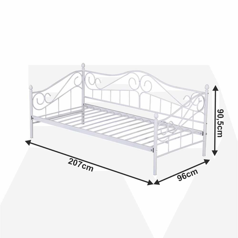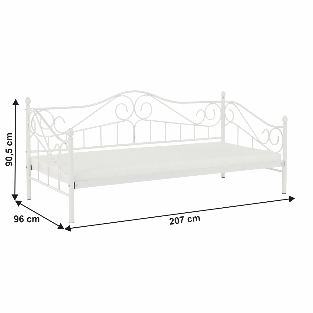Kovová postel s kovovým roštem, DAINA Materiál: kov Barva: bílá Vnější rozměry postele (ŠxHxV): 207x96x90,5 cm Plocha na spaní: 90x200 cm Výška po rošt: 30 cm Nosnost: 90 kg Dodávána s kovovým roštem Dodávána bez matrace Dodávané v demontu Možnost dokoupení matrace s rozměrem 90x200 cm