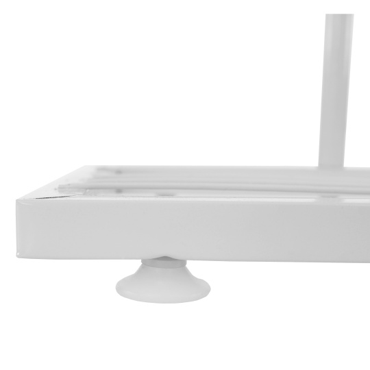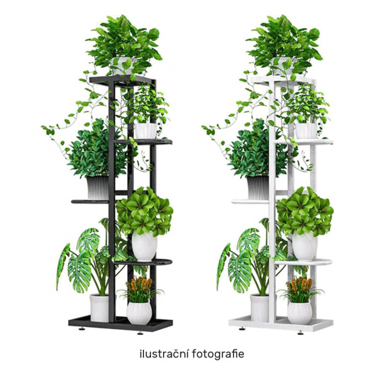 Materiál: kov Barva: bílá Rozměry (ŠxHxV): 43x22x126 cm Tloušťka tyče: 1,6 cm Rozměry police (ŠxH): 21x22 cm Výška spodní police: 23 cm Výška druhé police: 31 cm Výška třetí police: 42 cm Výška horní police: 21 cm kovová konstrukce 7 polic moderní styl Jako stojan na hrnkové rostliny Nohy zakončené ohebnými kluzáky na vyrovnání nerovnosti povrchu Dodávané v demontu
