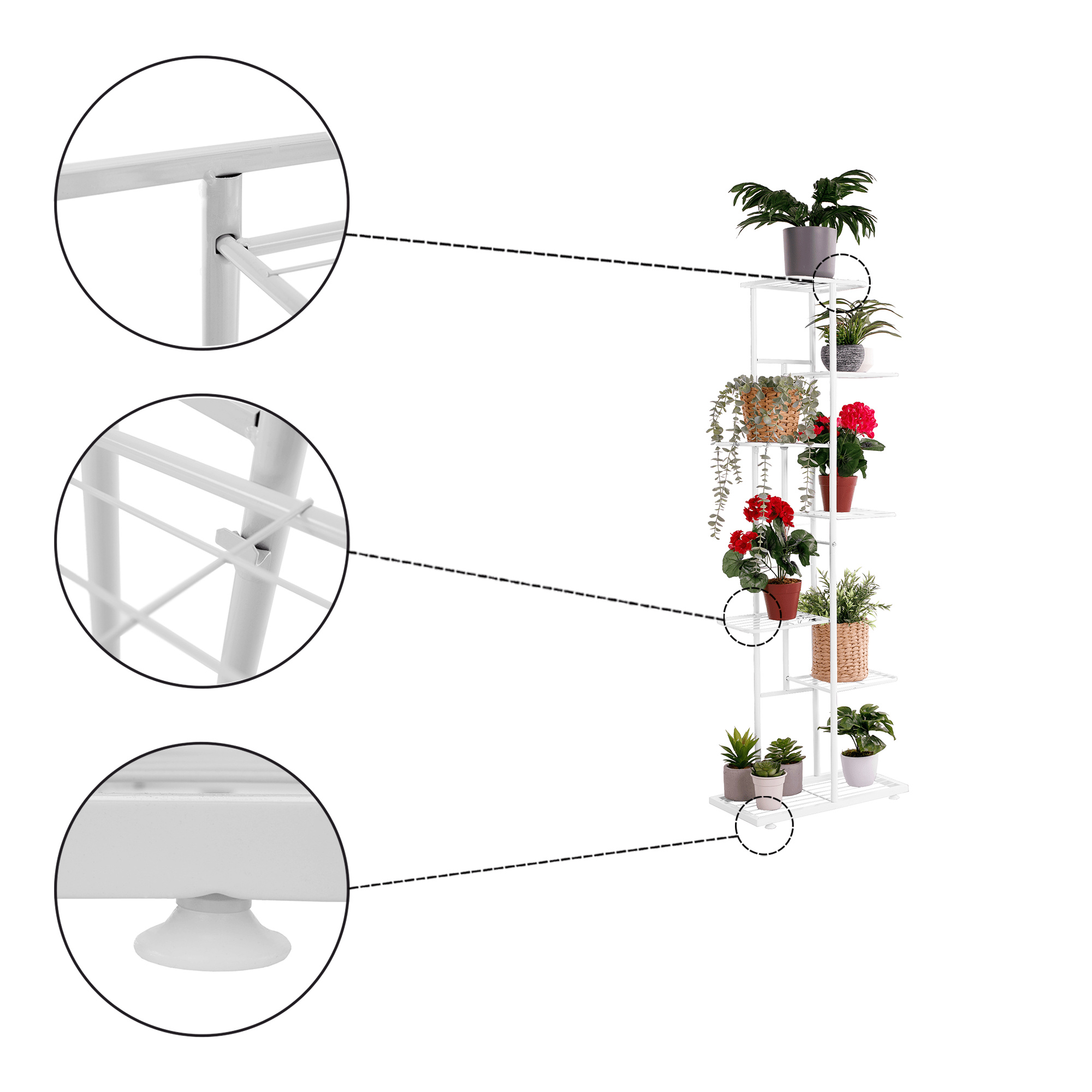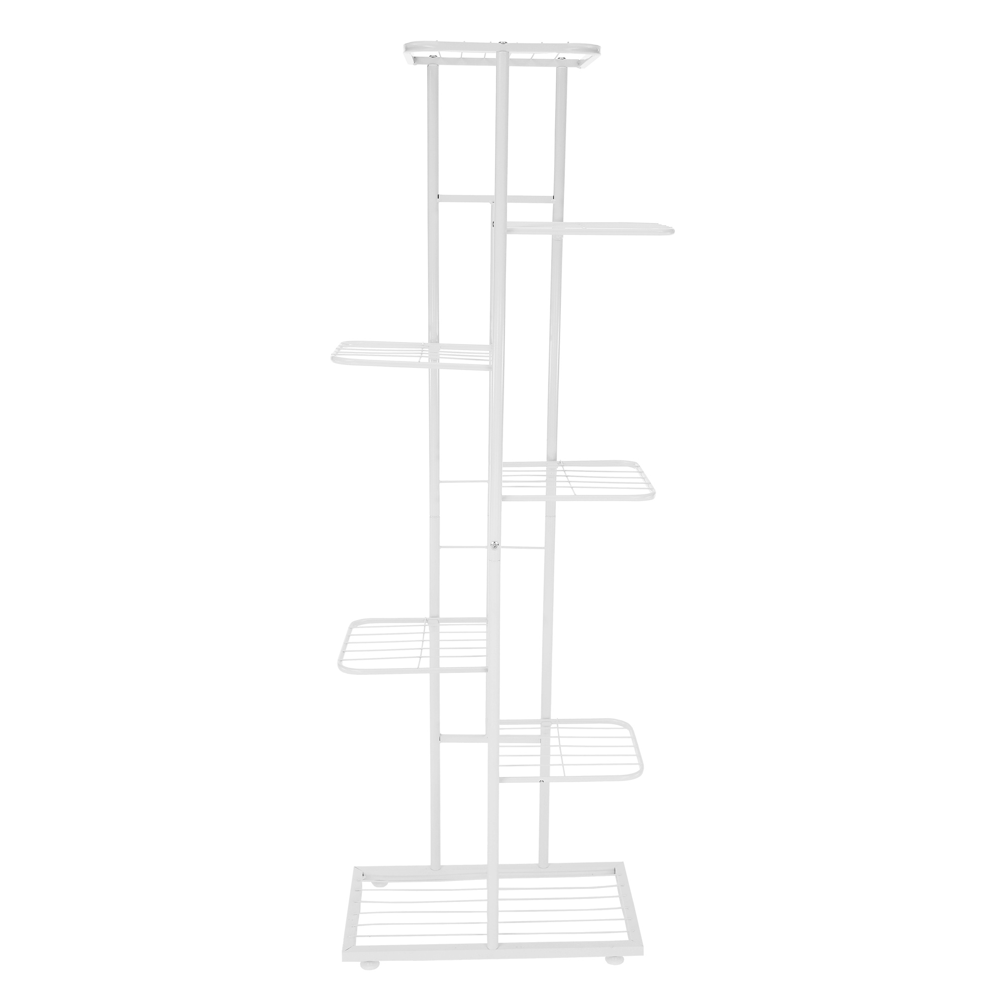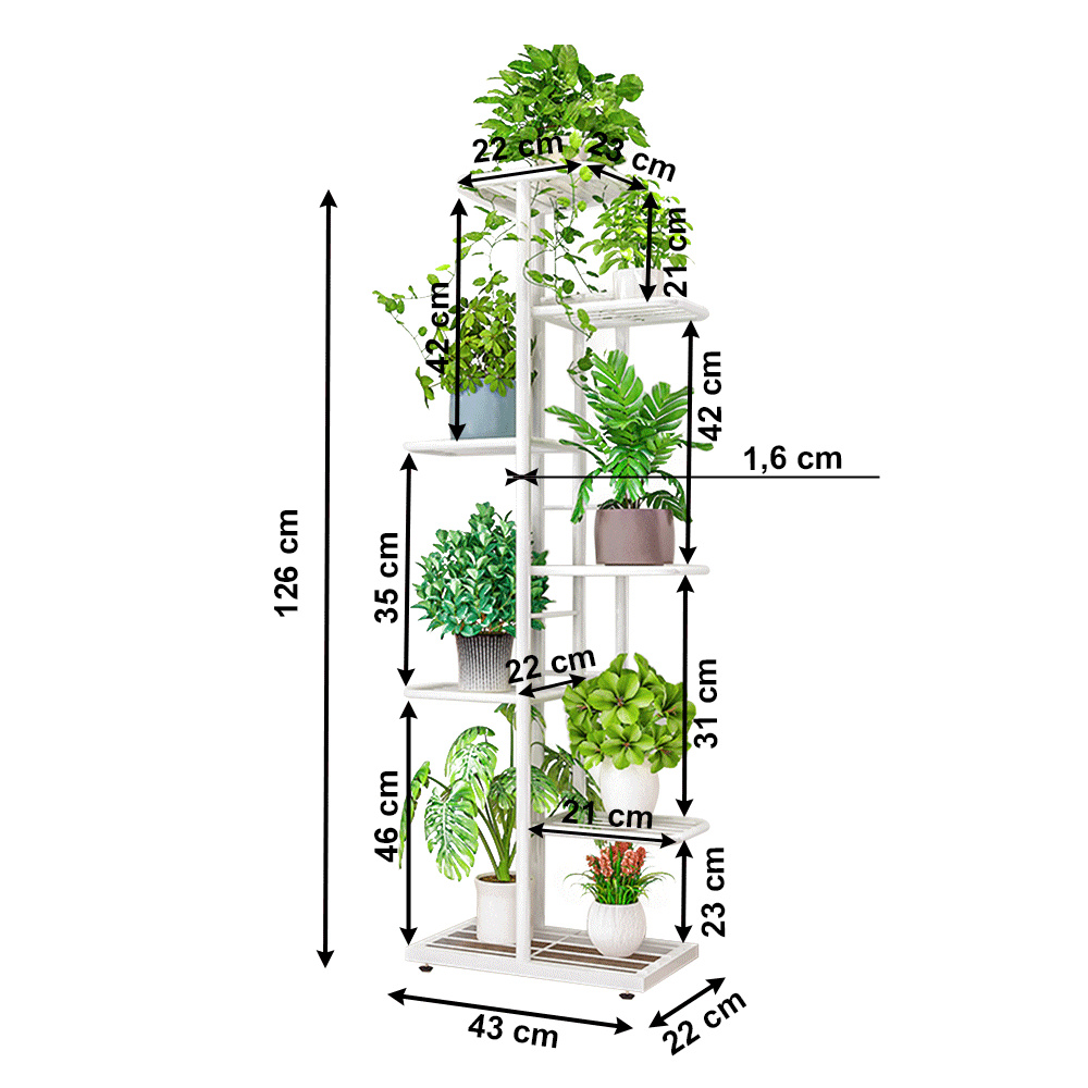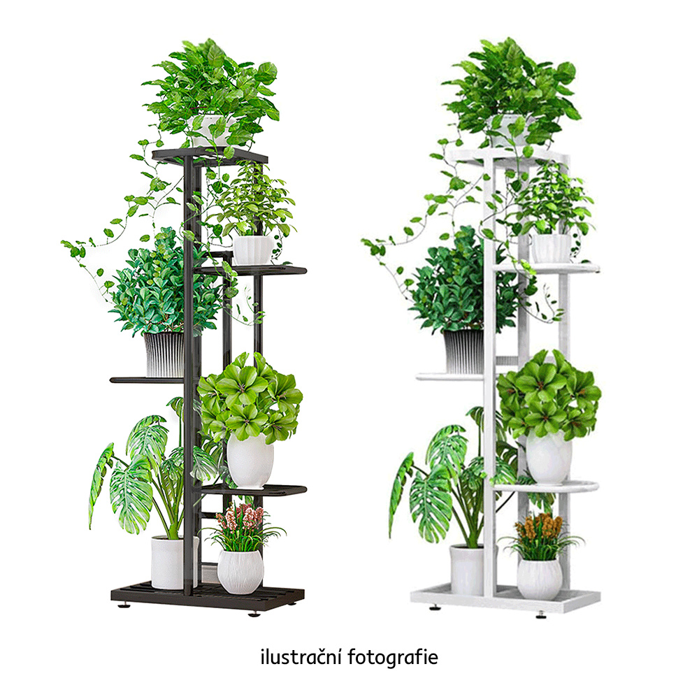 Materiál: kov Barva: bílá Rozměry (ŠxHxV): 43x22x126 cm Tloušťka tyče: 1,6 cm Rozměry police (ŠxH): 21x22 cm Výška spodní police: 23 cm Výška druhé police: 31 cm Výška třetí police: 42 cm Výška horní police: 21 cm kovová konstrukce 7 polic moderní styl Jako stojan na hrnkové rostliny Nohy zakončené ohebnými kluzáky na vyrovnání nerovnosti povrchu Dodávané v demontu