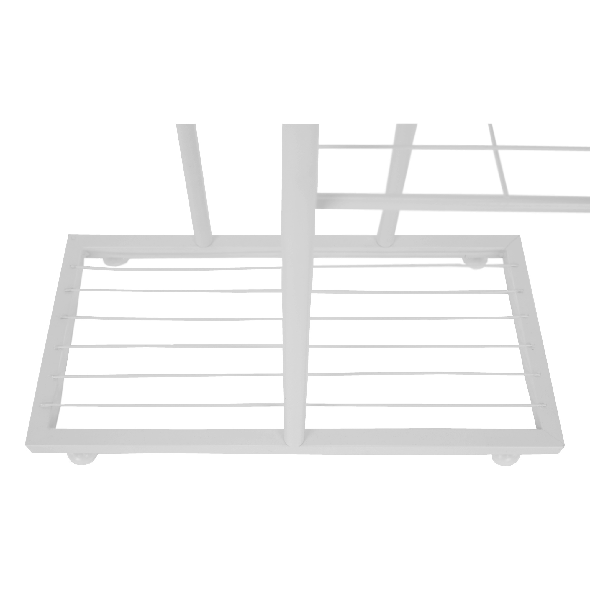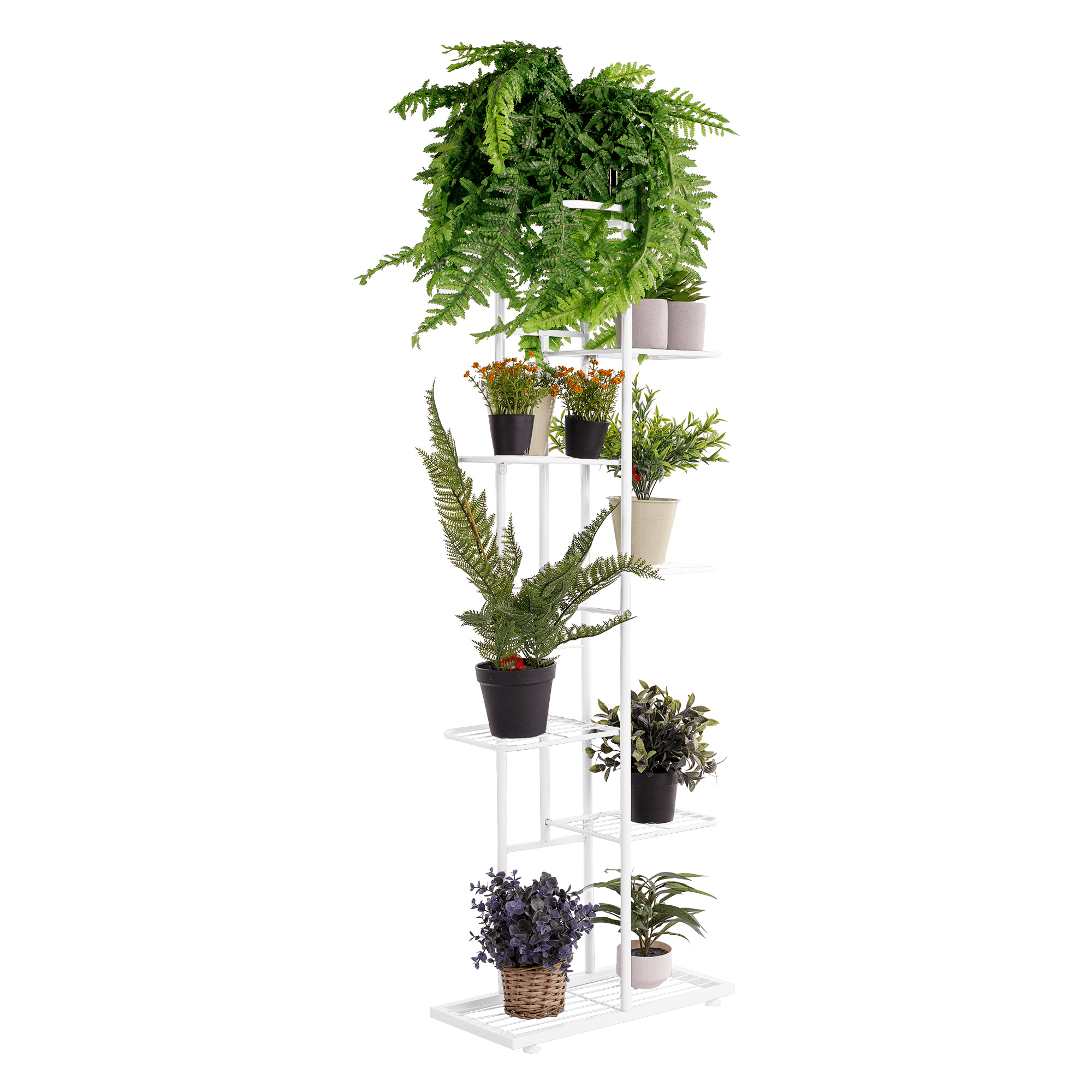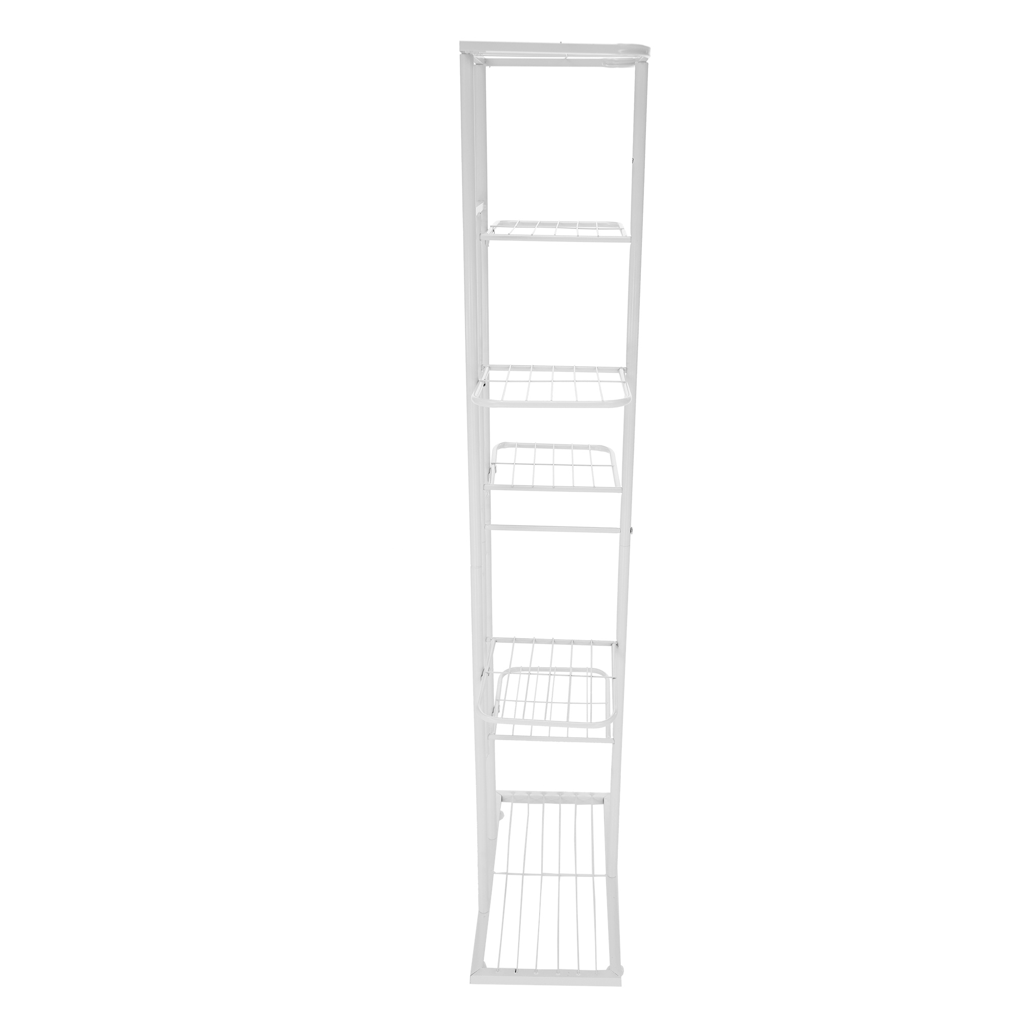 Materiál: kov Barva: bílá Rozměry (ŠxHxV): 43x22x126 cm Tloušťka tyče: 1,6 cm Rozměry police (ŠxH): 21x22 cm Výška spodní police: 23 cm Výška druhé police: 31 cm Výška třetí police: 42 cm Výška horní police: 21 cm kovová konstrukce 7 polic moderní styl Jako stojan na hrnkové rostliny Nohy zakončené ohebnými kluzáky na vyrovnání nerovnosti povrchu Dodávané v demontu