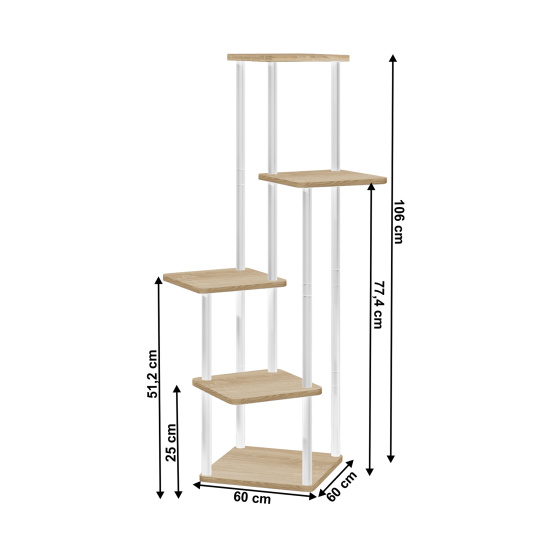 Materiál: kov/dřevotříska Barva: bílá/dub sonoma Rozměry (ŠxHxV): 30x30x106,5 cm Jako stojan na hrnkové rostliny 5 polic Kovová konstrukce Nosnost na polici: 3 kg Tloušťka tyče: 1,6 cm Výška mezi 1 a 2 policí: 27,5 cm Výška mezi 1 a 3 policí: 54 cm Výška mezi 1a 4 policí: 80cm Moderní styl Dodáváno v demontu