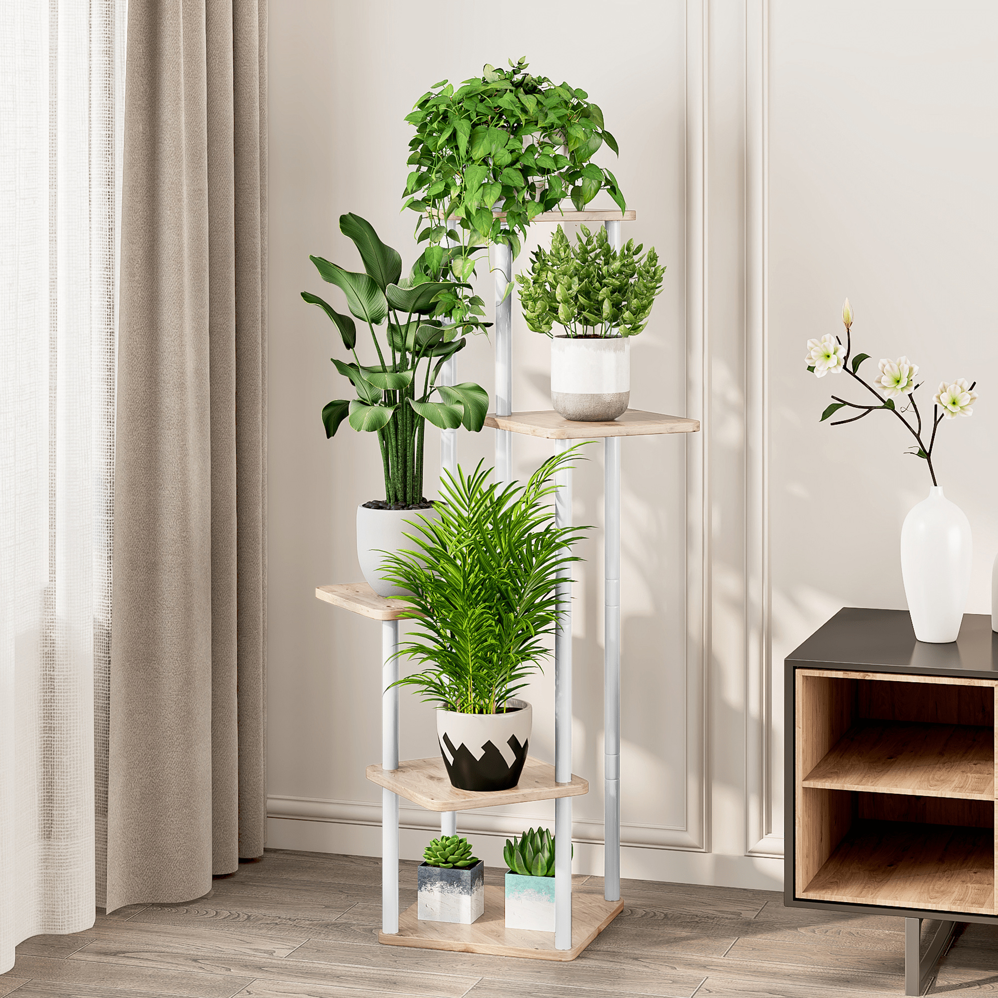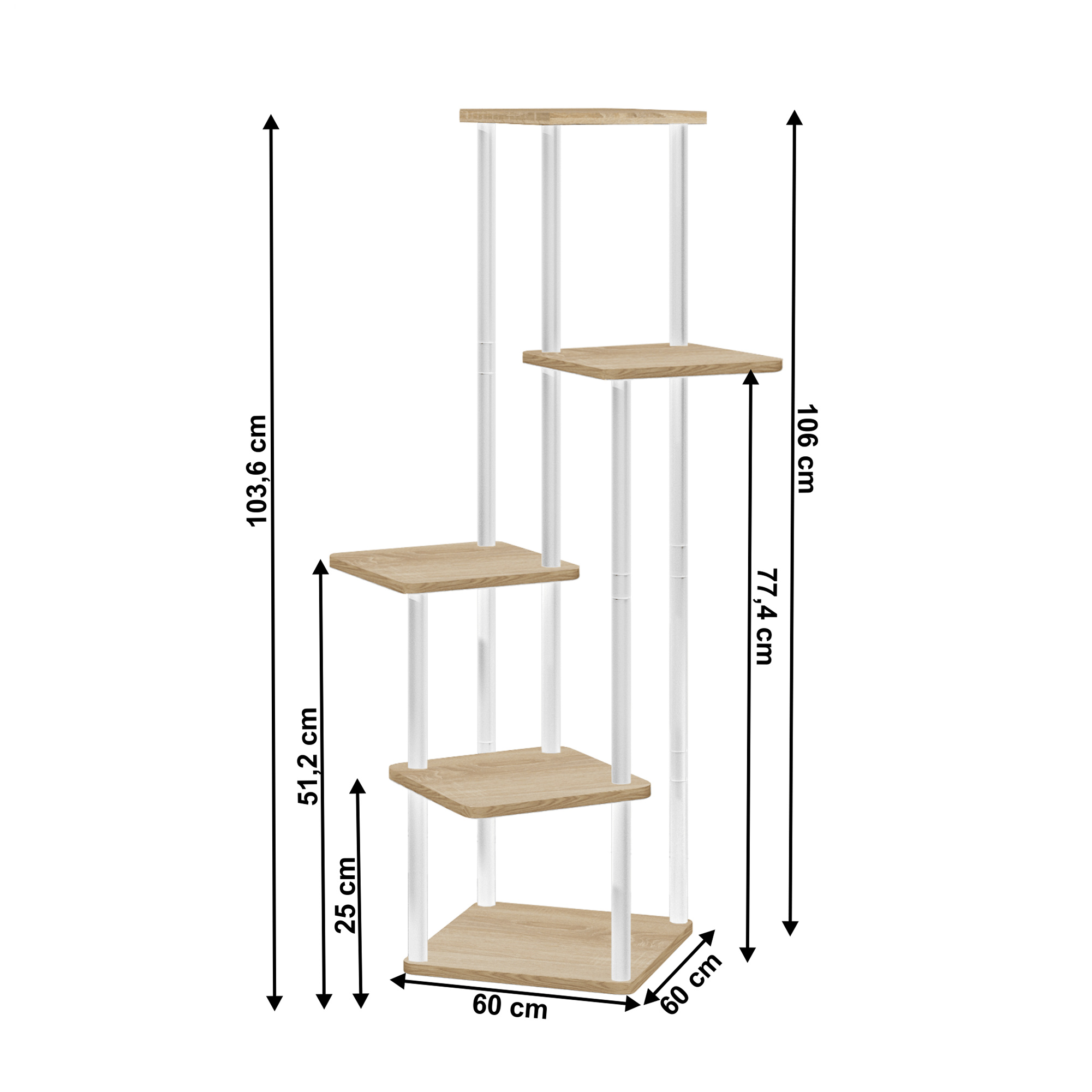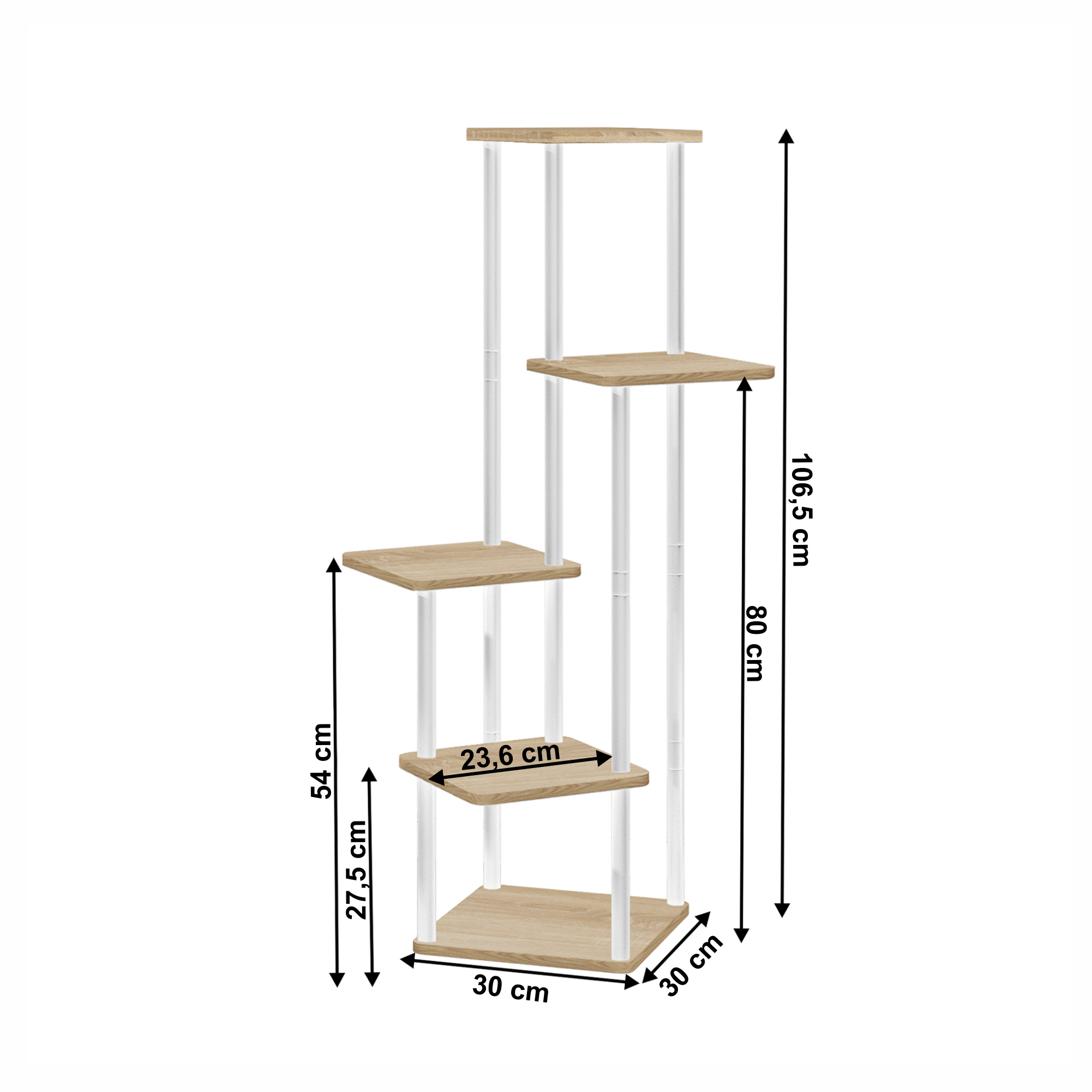 Materiál: kov/dřevotříska Barva: bílá/dub sonoma Rozměry (ŠxHxV): 30x30x106,5 cm Jako stojan na hrnkové rostliny 5 polic Kovová konstrukce Nosnost na polici: 3 kg Tloušťka tyče: 1,6 cm Výška mezi 1 a 2 policí: 27,5 cm Výška mezi 1 a 3 policí: 54 cm Výška mezi 1a 4 policí: 80cm Moderní styl Dodáváno v demontu
