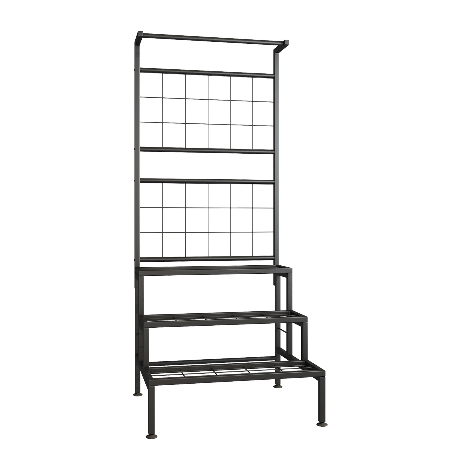Materiál: kov Barva: černá Rozměry (ŠxHxV): 60x54x158 cm Kovová konstrukce Tři police Dvě části k zavěšení Tyč na zavěšení Nosnost spodní police: 15-20 kg Nosnost střední police: 15 kg Nosnost vrchní police: 10-15 kg Nosnost tyče na zavěšení: 10-13 kg Dodáváno v demontu