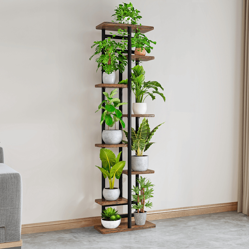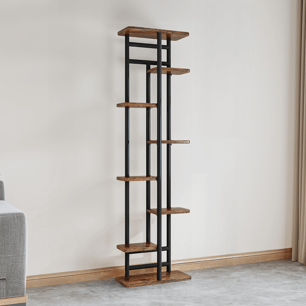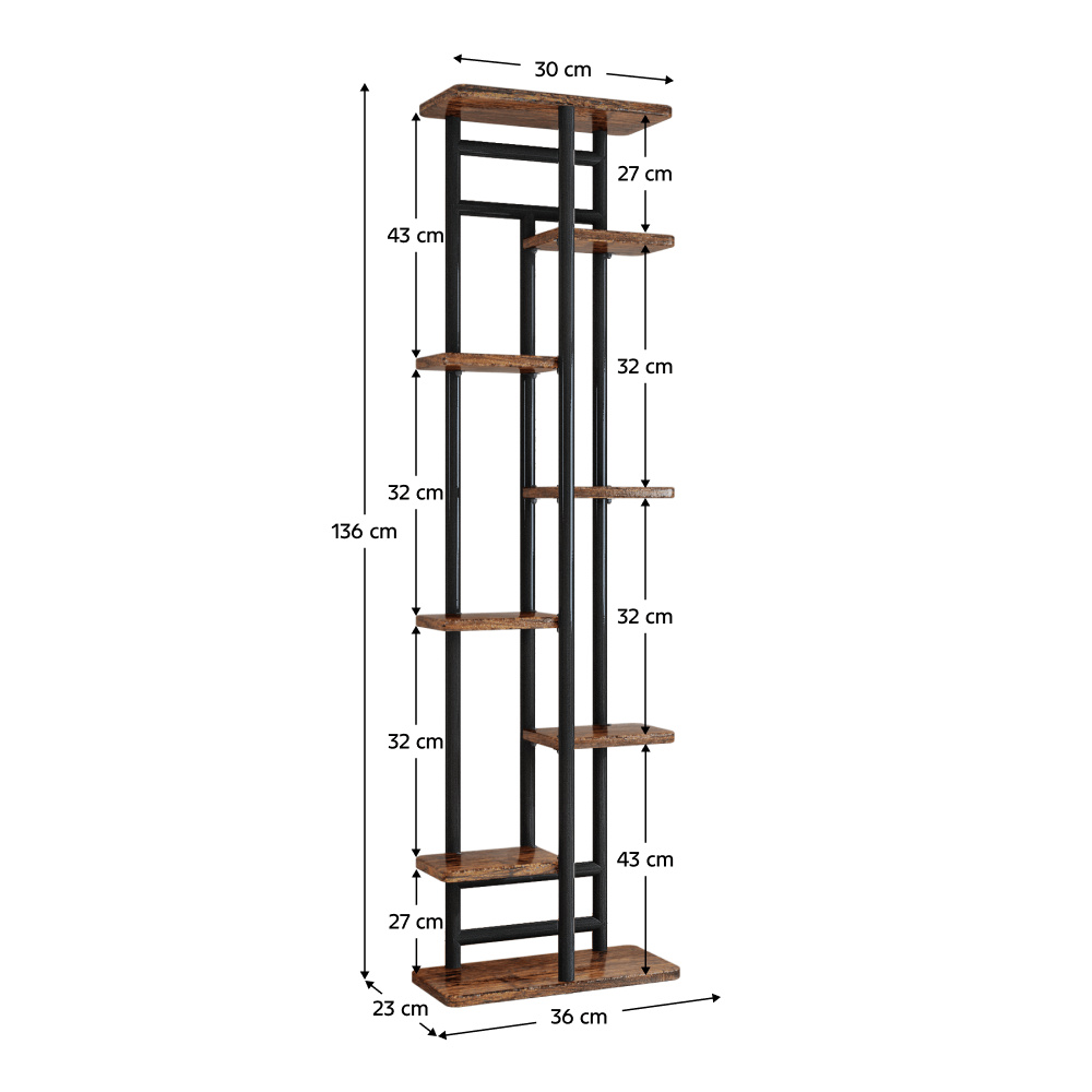 Materiál: kov/DTD Barva: černá/rustikální dřevo Rozměry (ŠxHxV): 36x23x136 cm Šířka vrchní police: 30 cm Výška mezi 1 a 2 policí z levé strany: 27 cm Výška mezi 2 a 3 policí z levé strany: 32 cm Výška mezi 3 a 4 policí z levé strany: 32 cm Výška mezi 4 a 5 policí z levé strany: 43 cm Výška mezi 1 a 2 policí z pravé strany: 43 cm Výška mezi 2 a 3 policí z pravé strany: 32 cm Výška mezi 3 a 4 policí z pravé strany: 32 cm Výška mezi 4 a 5 policí z pravé strany: 27 cm Tloušťka tyče: 1,6 cm Nosnost na polici: 2 kg Doporučujeme rovnoměrné zatížení polic Jako stojan na hrnkové rostliny Praktický Víceúčelový Moderní design Dodáván v demontu
