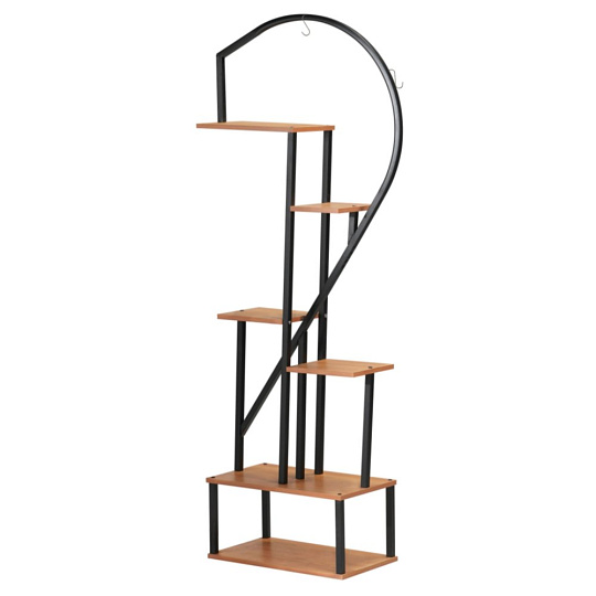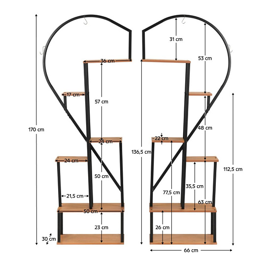 Materiál: kov/MDF laminovaná Barva: černá/dub Rozměry (ŠxHxV): 66x30x170 cm Tloušťka materiálu MDF: 1,6 cm Jako stojan na hrnkové rostliny Police Nosnost na polici: 3 kg Háčky Nosnost háčku: 2 kg Doporučujeme rovnoměrné zatížení polic Set 2 kusů Praktický Víceúčelový Moderní styl Dodáváno v demontu