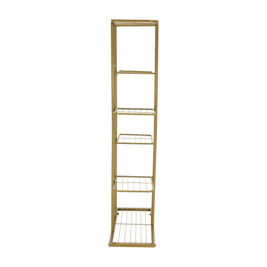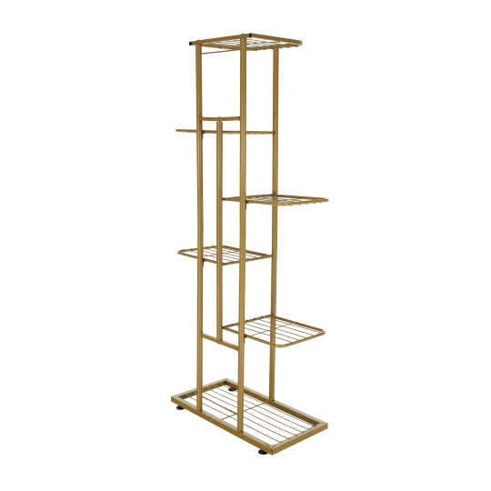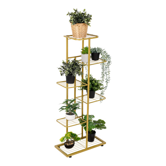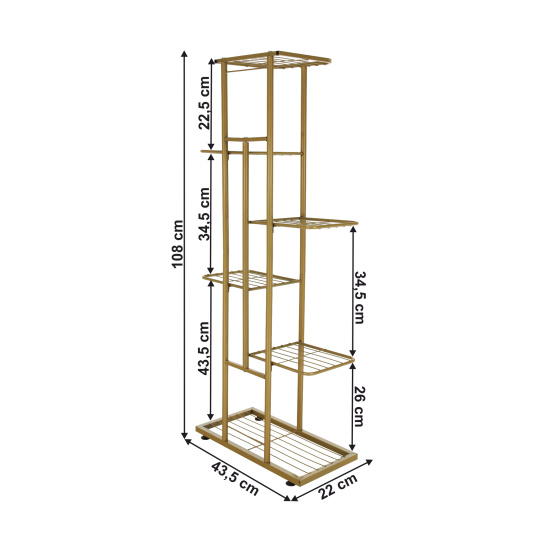 Materiál: kov Farba: zlatá Rozmery (ŠxHxV): 43,5x22x108 cm Nosnosť na jednu policu: 2 kg Hrúbka tyče: 1,6 cm Výška spodnej police z pravej strany: 26 cm Výška druhej police z pravej strany: 34,5 cm Výška prvej police z ľavej strany: 43,5 cm Výška druhej police z ľavej strany: 34,5 cm Výška tretej police: 22,5 cm Výška nožičiek: 1 cm Kovová konštrukcia 6 políc Moderný štýl Ako stojan na črepníkové rastliny Nohy zakončené ohybnými klzákmi na vyrovnanie nerovnosti povrchu Dodávané v demonte