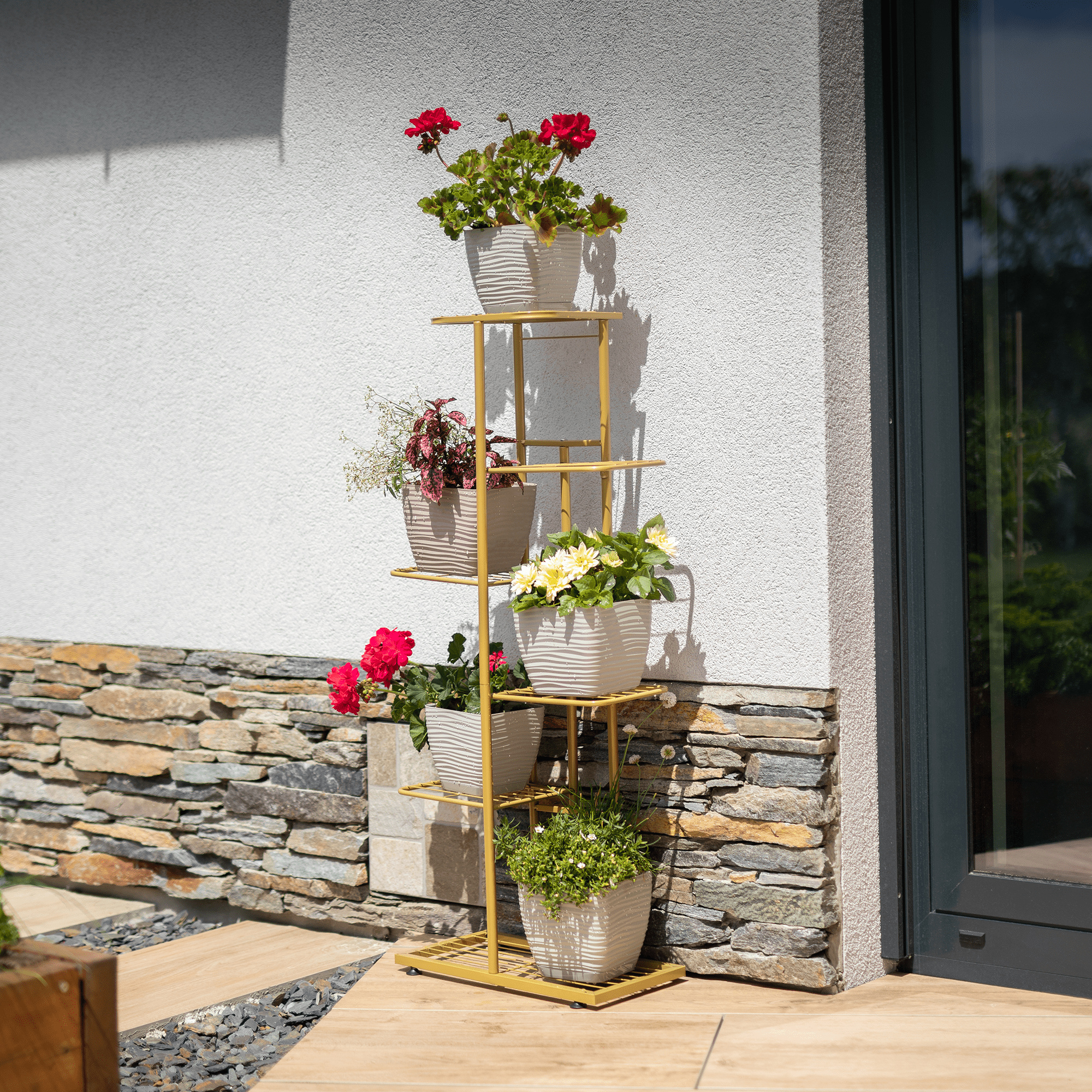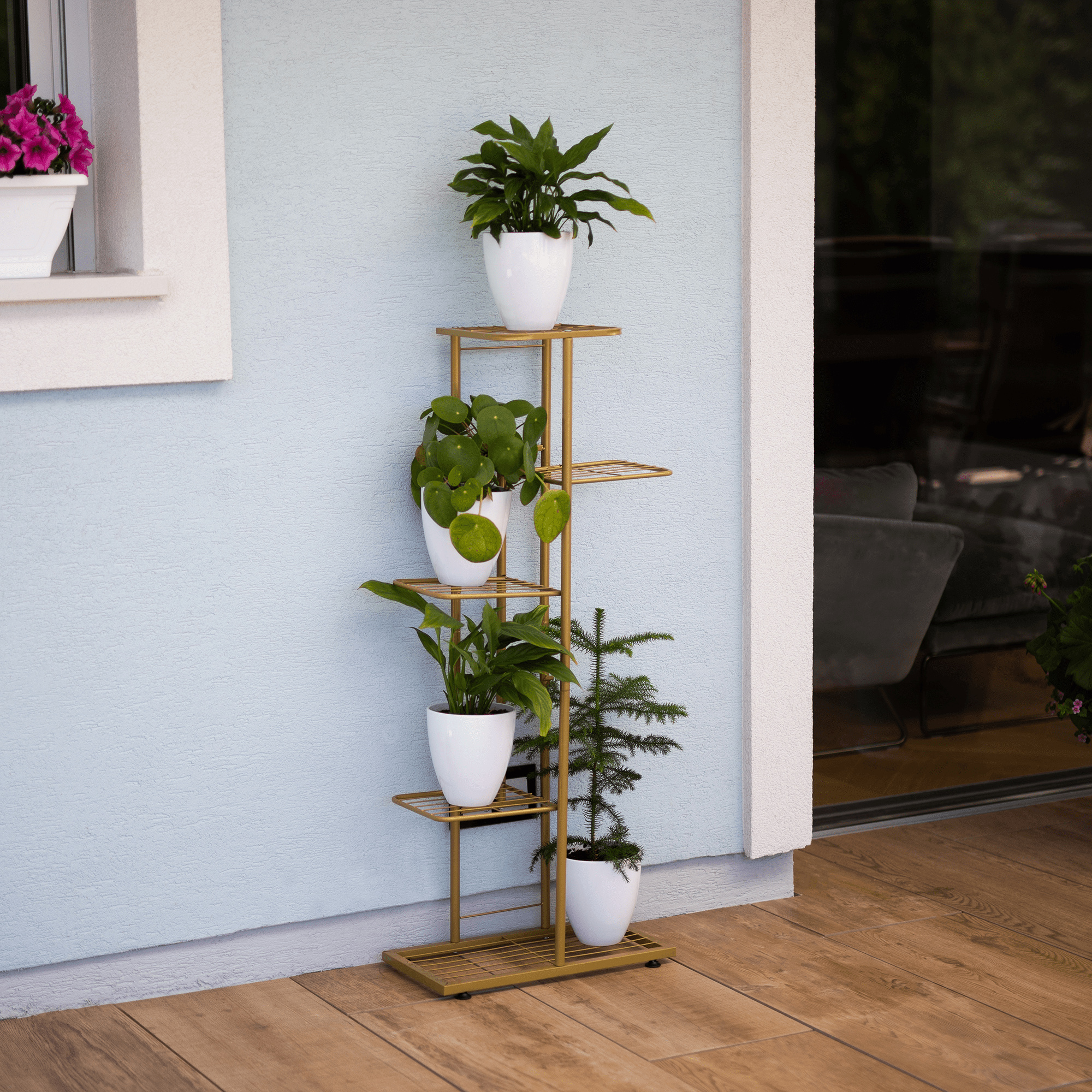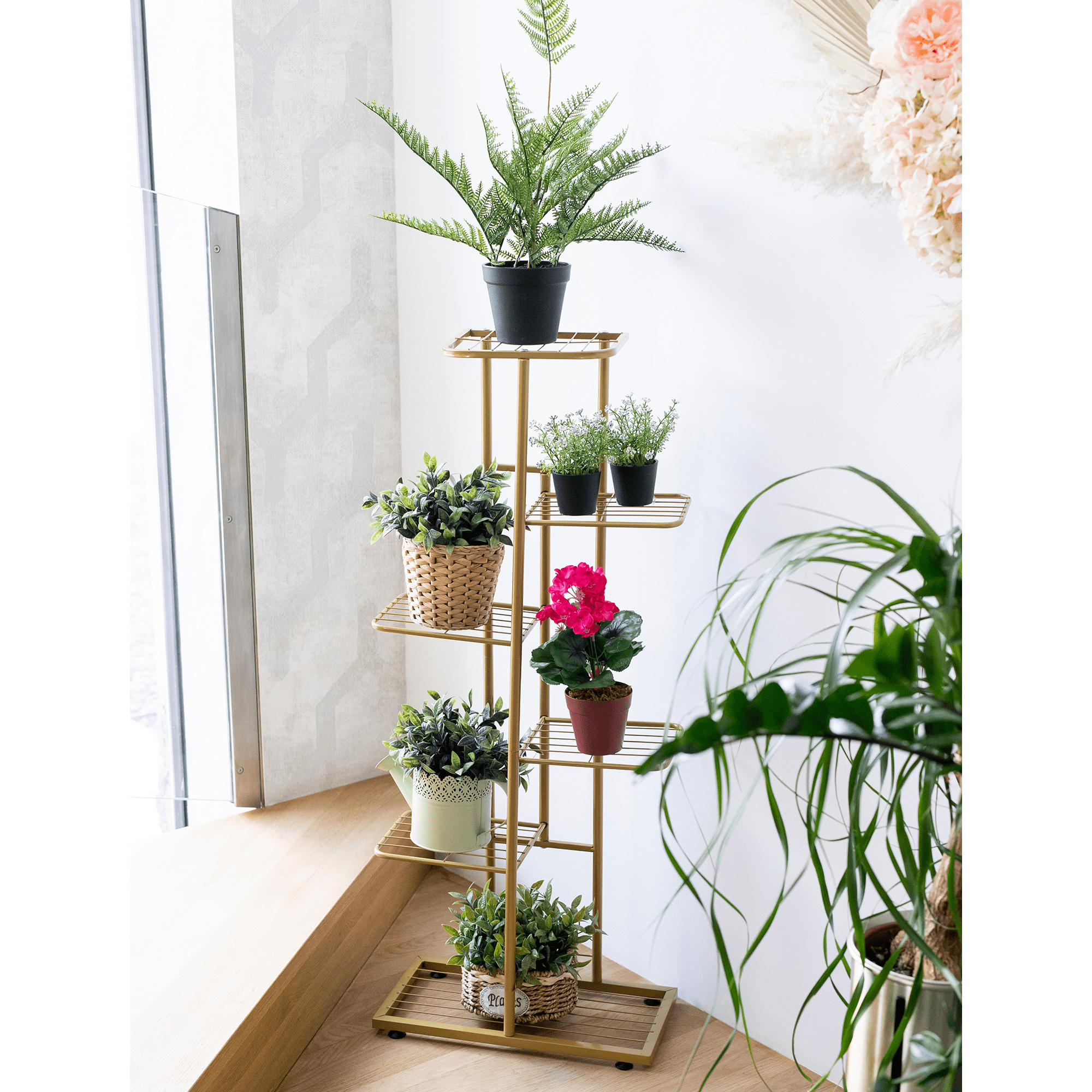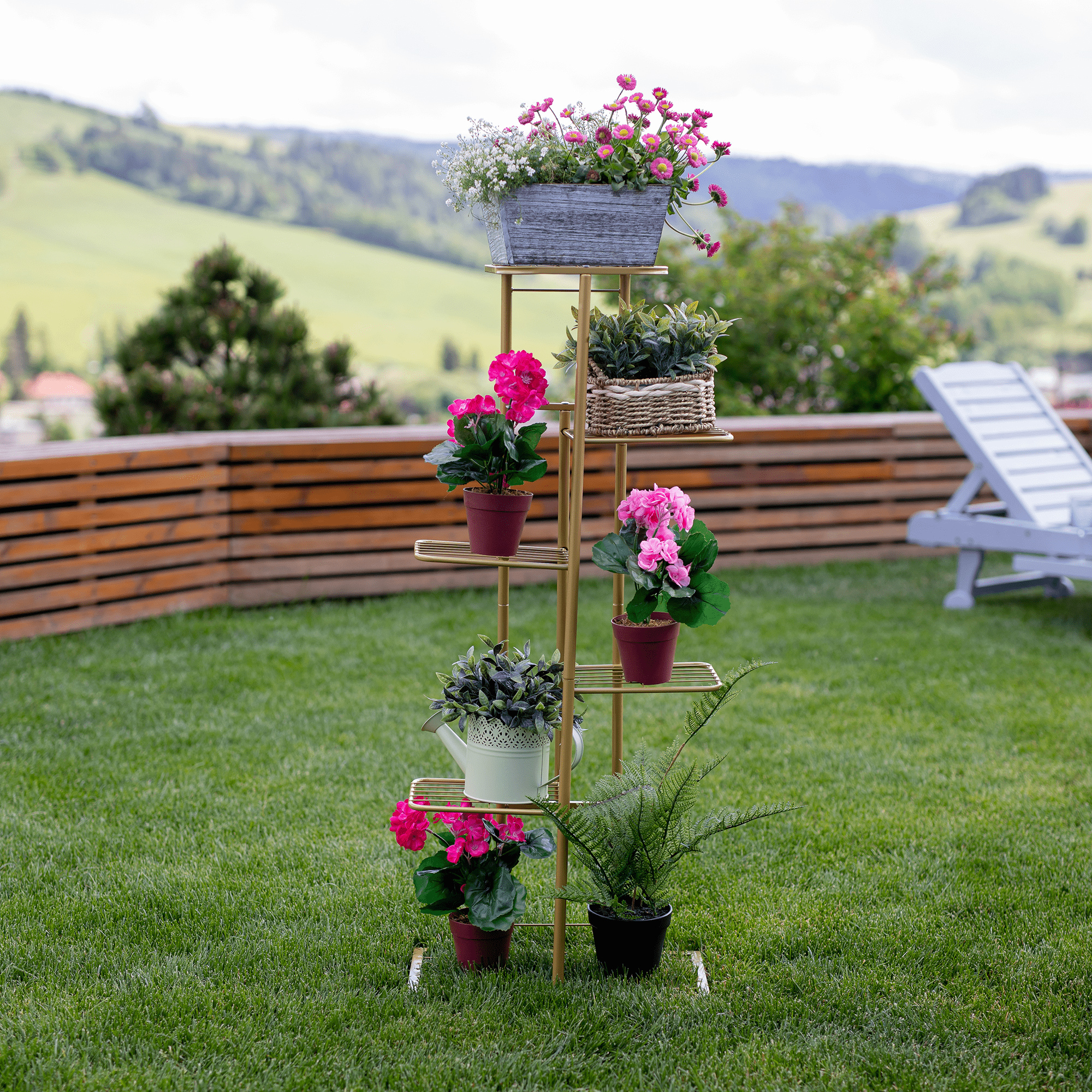 Materiál: kov Farba: zlatá Rozmery (ŠxHxV): 43,5x22x108 cm Nosnosť na jednu policu: 2 kg Hrúbka tyče: 1,6 cm Výška spodnej police z pravej strany: 26 cm Výška druhej police z pravej strany: 34,5 cm Výška prvej police z ľavej strany: 43,5 cm Výška druhej police z ľavej strany: 34,5 cm Výška tretej police: 22,5 cm Výška nožičiek: 1 cm Kovová konštrukcia 6 políc Moderný štýl Ako stojan na črepníkové rastliny Nohy zakončené ohybnými klzákmi na vyrovnanie nerovnosti povrchu Dodávané v demonte