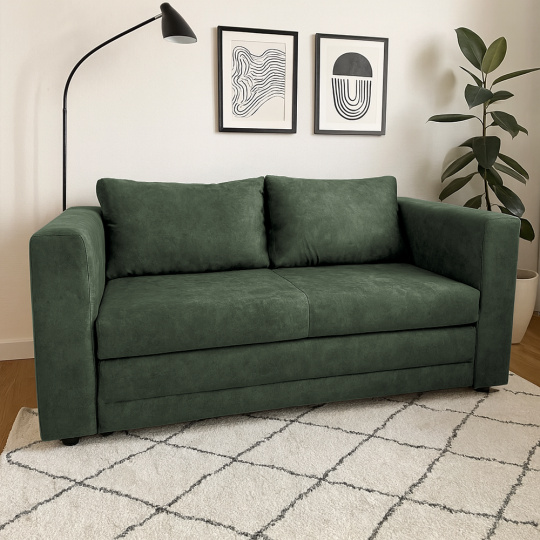 Materiál: látka ENJOY 47/sosna Oděruodolnost textilie podle testu Martindale: 45 000 oděrů Barva: zelená Rozměry (ŠxHxV): 138x69x63 cm Plocha na spaní (ŠxD): 110x198 cm Výška sedu: 34,5 cm Hloubka sedu s polštářem: 45 cm Hloubka sedu bez polštáře : 67 cm Šířka sedu: 100 cm Výška spaní: 13 cm Tloušťka materiálu konstrukce: 2,2 cm Rozměry opěrky na ruku (ŠxHxV): 14x70x59 cm Na nožičkách Materiál nožiček: plast Barva nožiček: černá Výška spodního prostoru od podlahy: 3,5 cm Výplň: pěna PU Tvrdost: T25 Celočalouněná Rozkládací S polštáři Rozměry polštářů (ŠxV): 57x38 cm Nosnost: 100 kg Hmotnost: 35 kg Praktická Moderní Dodávána v demontu