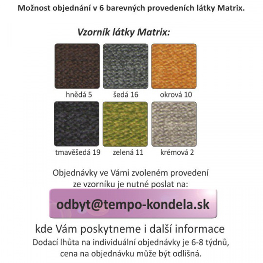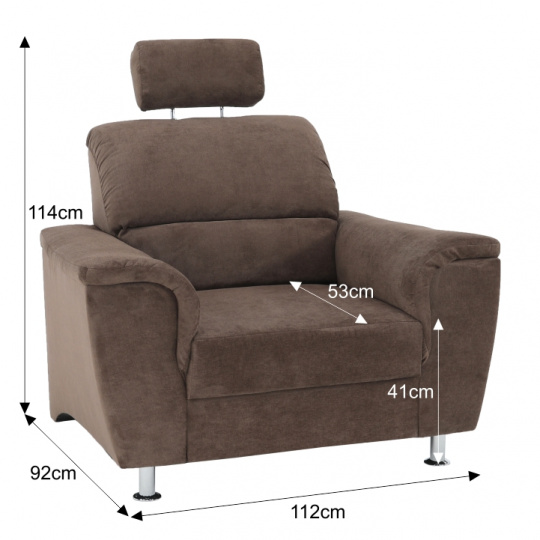 Křeslo SANTIAGO s polohovací opěrkou hlavy Materiál: látka Oděruodolnost textilie podle testu Martindale: 72 000 oděrek Barevné provedení: Matrix 5 hnědá Kovové nožičky s povrchovou úpravou chrom Rozměry (ŠxHxV): 112x92x114 cm Výška sedu: 41cm Hloubka sedu: 53 cm Nosnost na osobu: 90 kg Výška spodního prostoru od podlahy: 10 cm Možnost objednání v 6 barevných provedeních látky Matrix v ceně: roh - 33.090 Kč, křeslo - 9.890 Kč, taburet - 3.290 Kč. Při individuální objednávce je třeba zaplatit 10% zálohu z dané částky. Po uhrazení zálohy bude Váš požadavek zadán do výroby. Doba dodání 6-8 týdnů. Váš výběr poznamenejte do poznámky v objednávce.