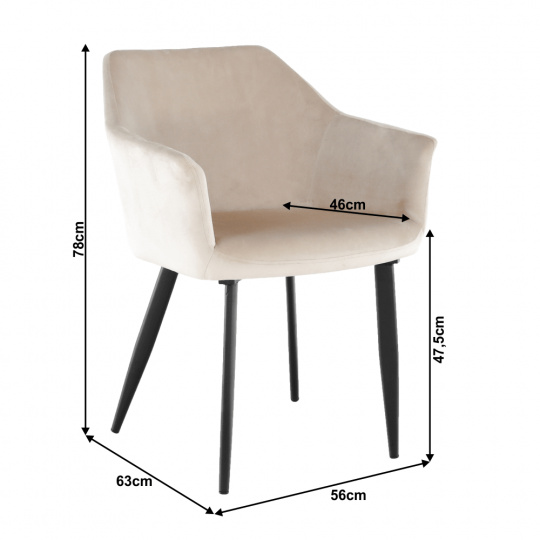 Materiál čalounění: Velvet látka Oděruodolnost textilie podle testu Martindale: 85 000 oděrů Barva: hnědá Materiál nohy: kov Barva: černá Rozměry (ŠxHxV): 66x66x83 cm Výška sedu : 48 cm Hloubka sedu: 43,5 cm Šířka sedu: 42 cm Výška zádové opěrky: 40 cm Šířka zádové opěrky: 52 cm Výška od zeme po opierku na ruky: 72cm Maximální nosnost: 10