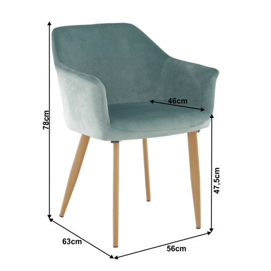 Designové křeslo ODOVEL Materiál: látka velvet/ kov Oděruodolnost textilie podle testu Martindale: 80 000 oděrek Barva: mentolová / buk Rozměry (ŠxHxV): 56x63x82 cm Výška sedu: 49 cm Hloubka sedu: 46 cm Nosnost: 90 kg Dodávané v demontu.