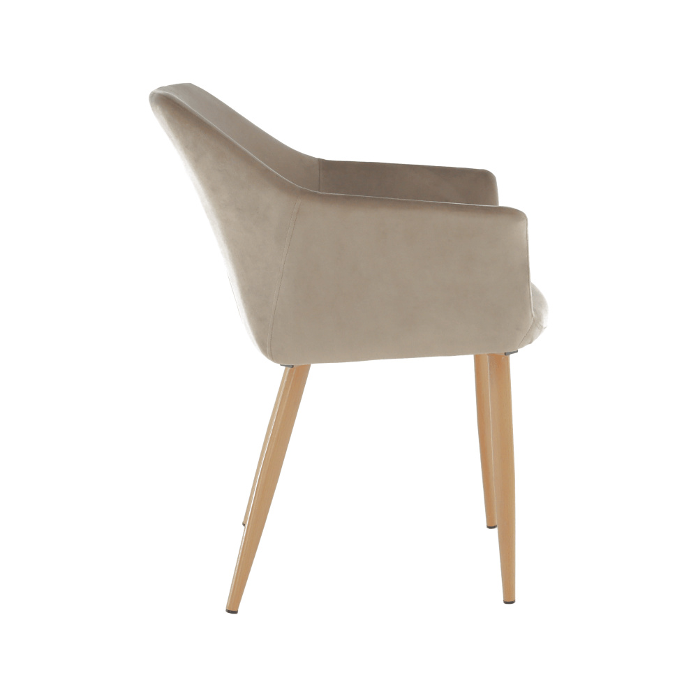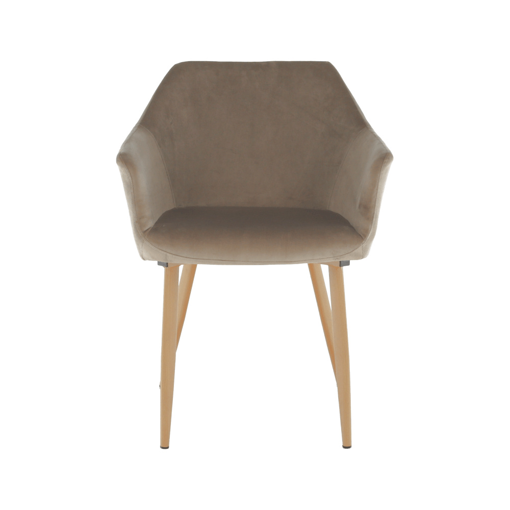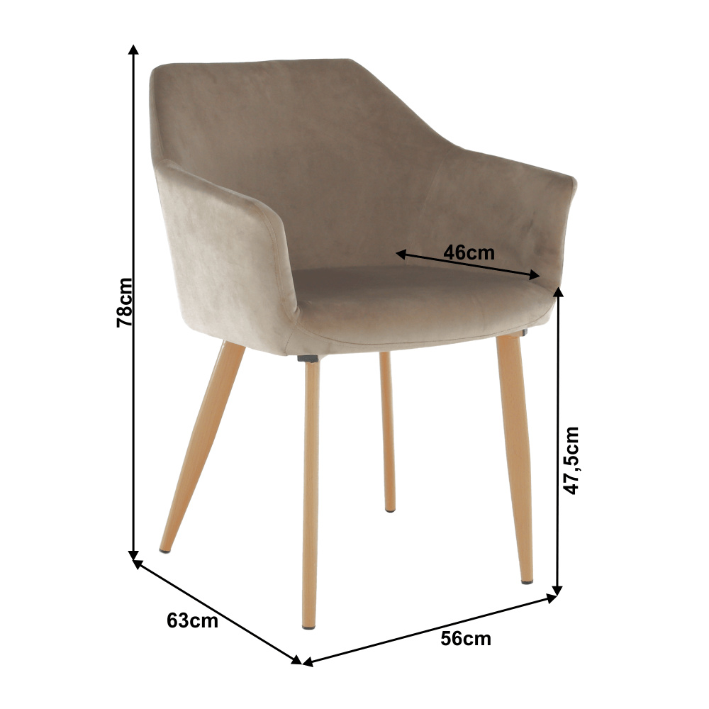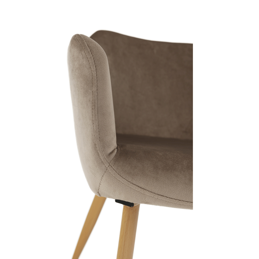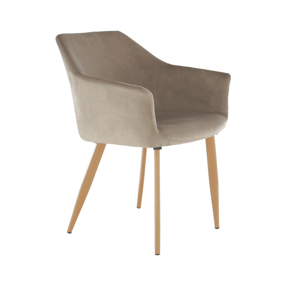 Designové křeslo ODOVEL Materiál: látka velvet / kov Oděruodolnost textilie podle testu Martindale: 80 000 oděrek Barva: taupe / buk Rozměry (ŠxHxV): 56x63x82 cm Výška sedu: 49 cm Hloubka sedu: 46 cm Nosnost: 90 kg Dodávané v demontu.
