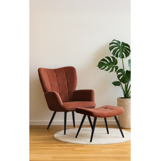 Materiál: látka Velvet 15/kov Oděruodolnost textilie podle testu Martindale: 95 000 oděrů Barevné provedení: hněd/černá Rozměry křesla (ŠxHxV): 70x78x97 cm Výška sedu: 46 cm Hloubka sedu: 53 cm Rozměry podnože (ŠxHxV): 56,5x40x39 cm Nožičky na podnožce jsou výškově nastavitelné Nosnost křesla: 90 kg Nosnost podnože: 80 kg Dodáváno v demontu