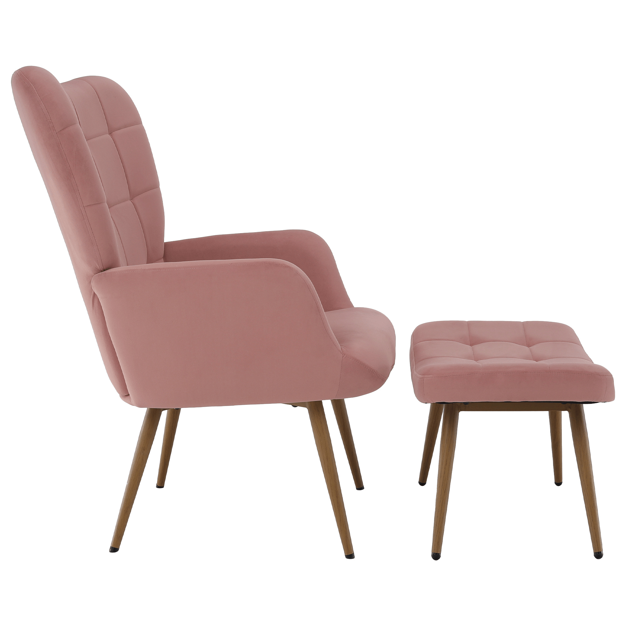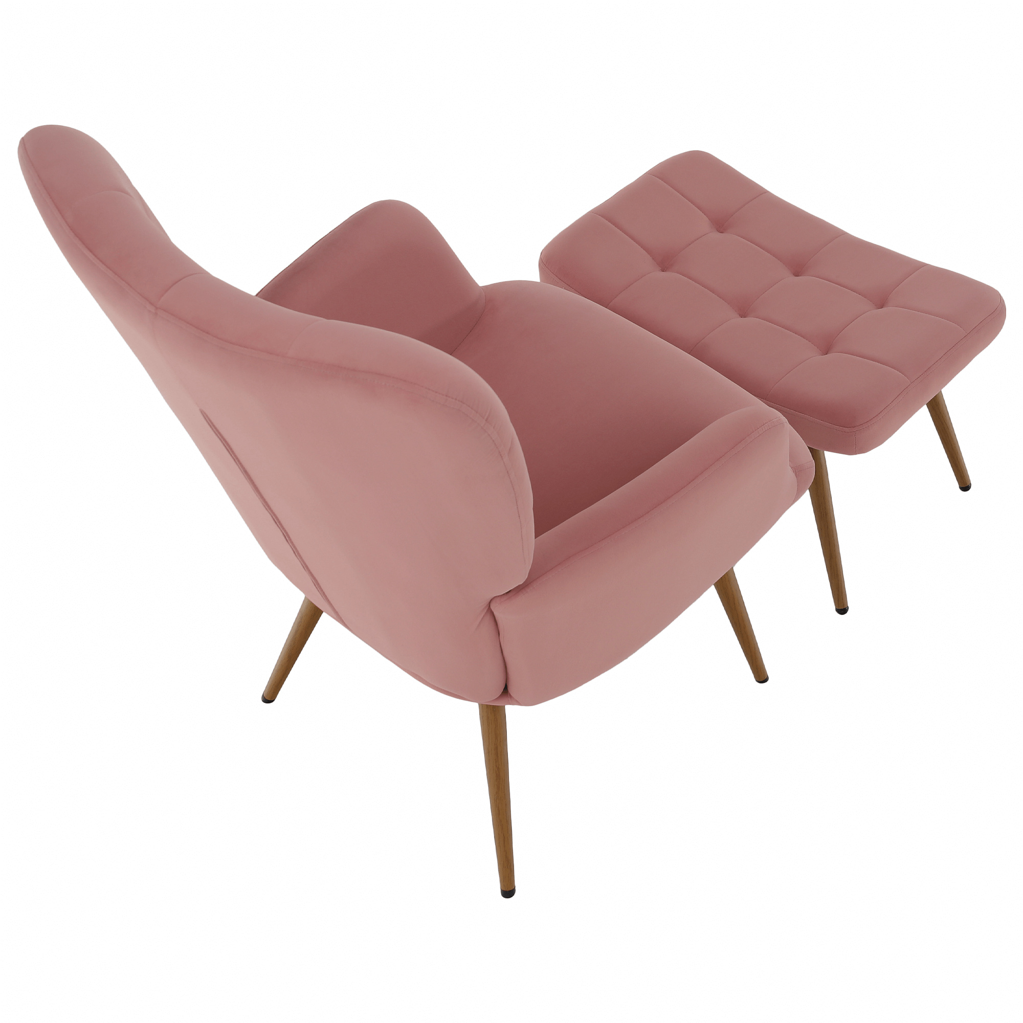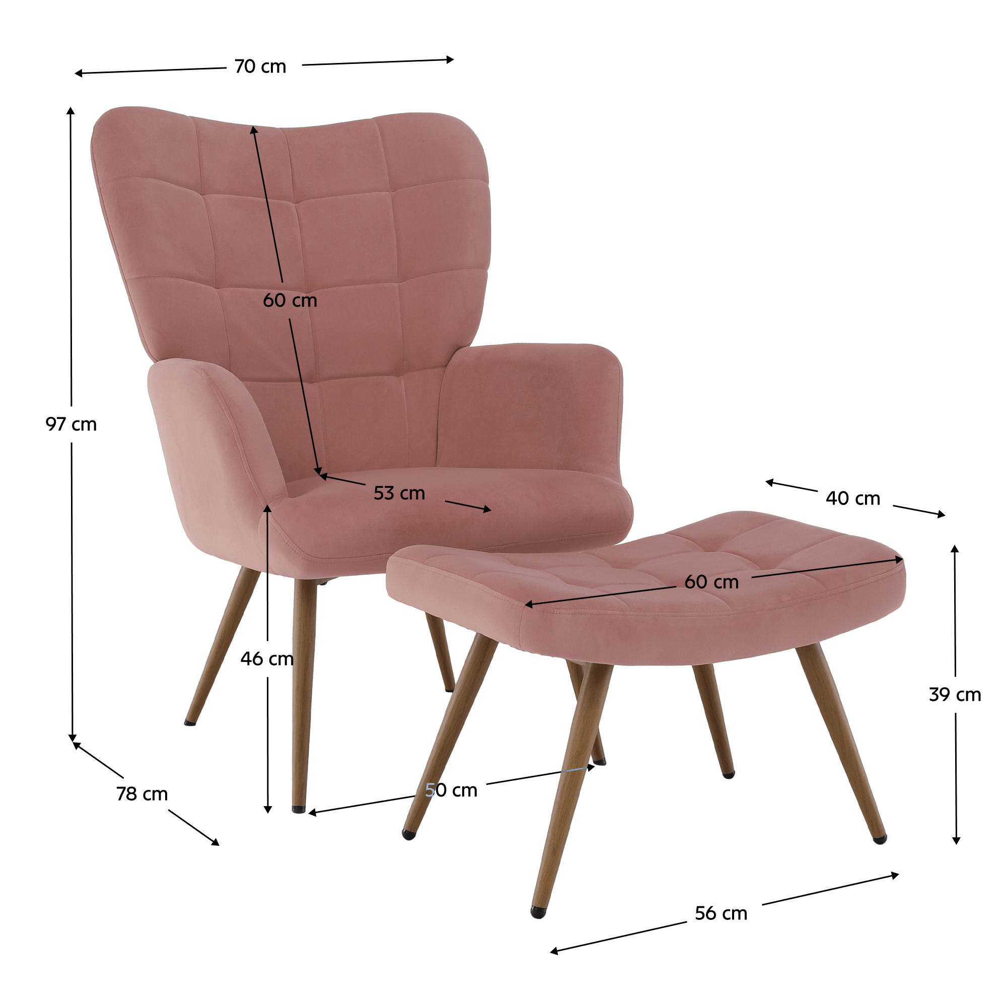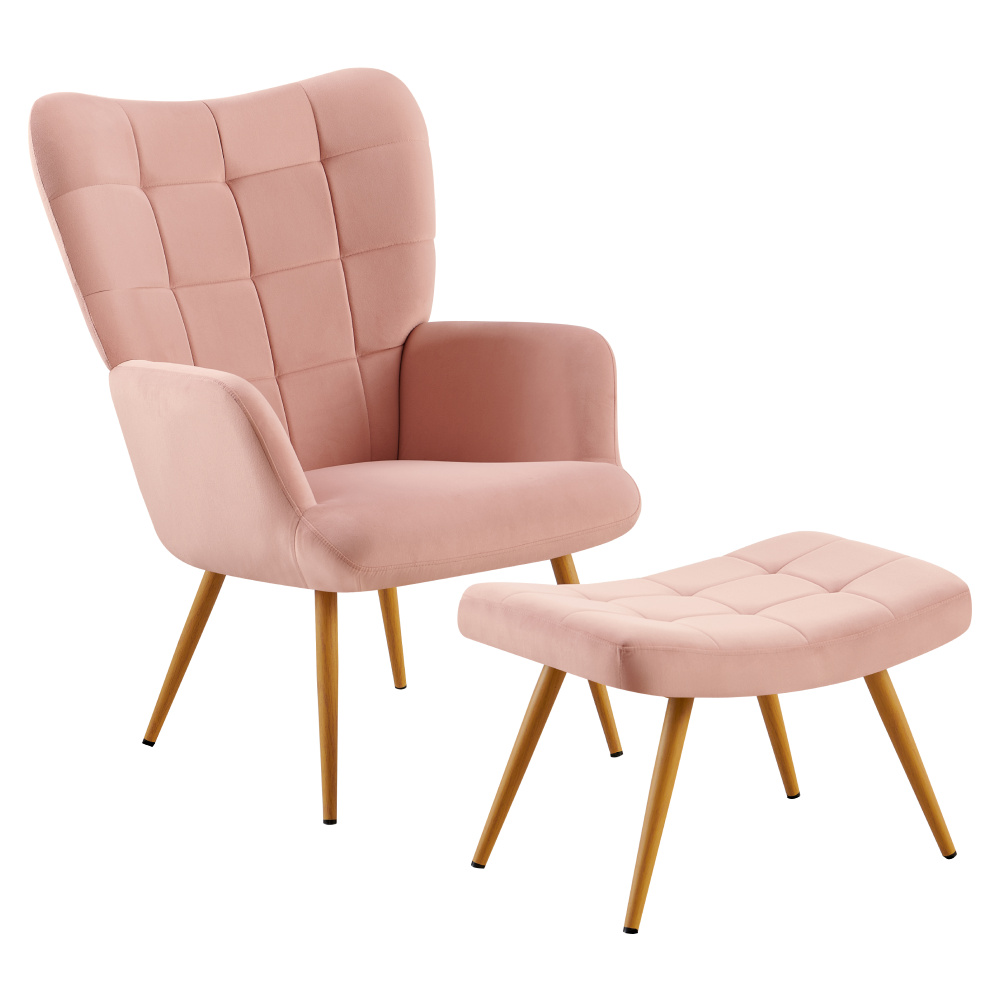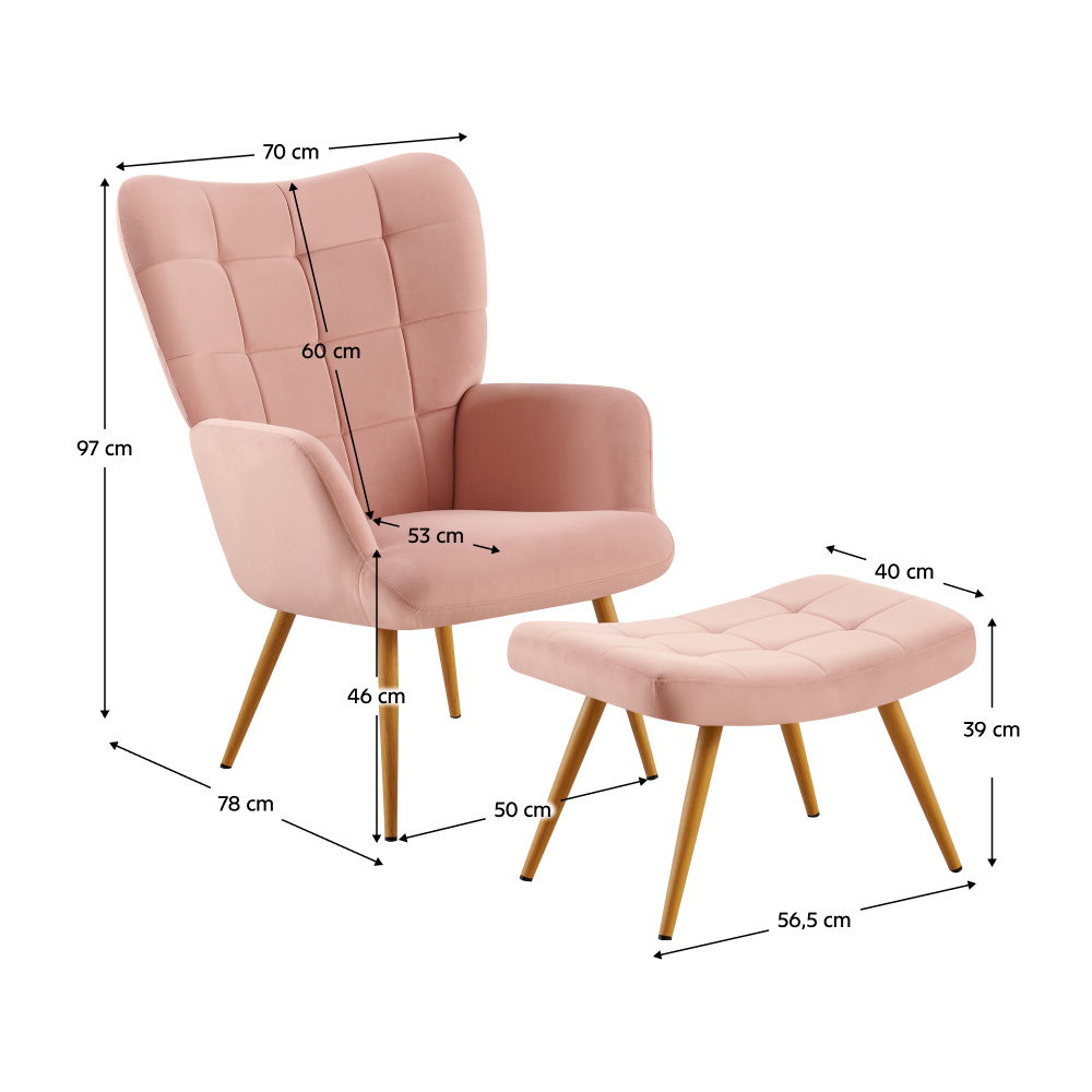 Materiál: látka Velvet 32/kov Oděruodolnost textilie podle testu Martindale: 95 000 oděrů Barevné provedení: růžová/dub Rozměry křesla (ŠxHxV): 70x78x97 cm Výška sedu: 46 cm Hloubka sedu: 53 cm Rozměry podnože (ŠxHxV): 56,5x40x39 cm Nožičky na podnožce jsou výškově nastavitelné Nosnost křesla: 90 kg Nosnost podnože: 80 kg Dodáváno v demontu