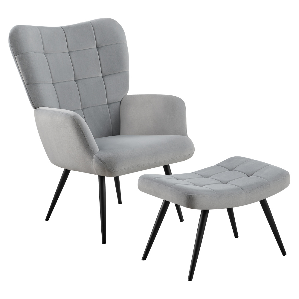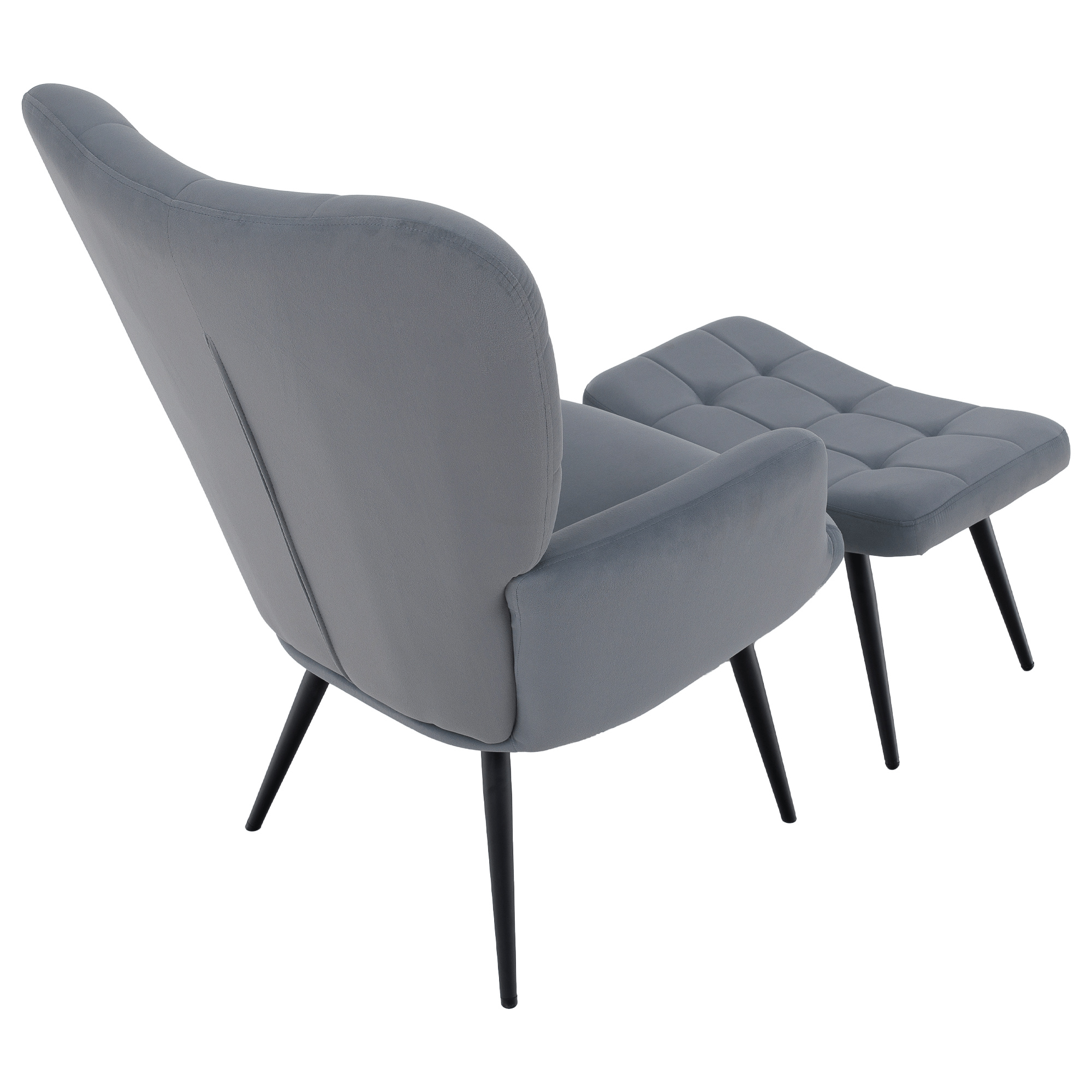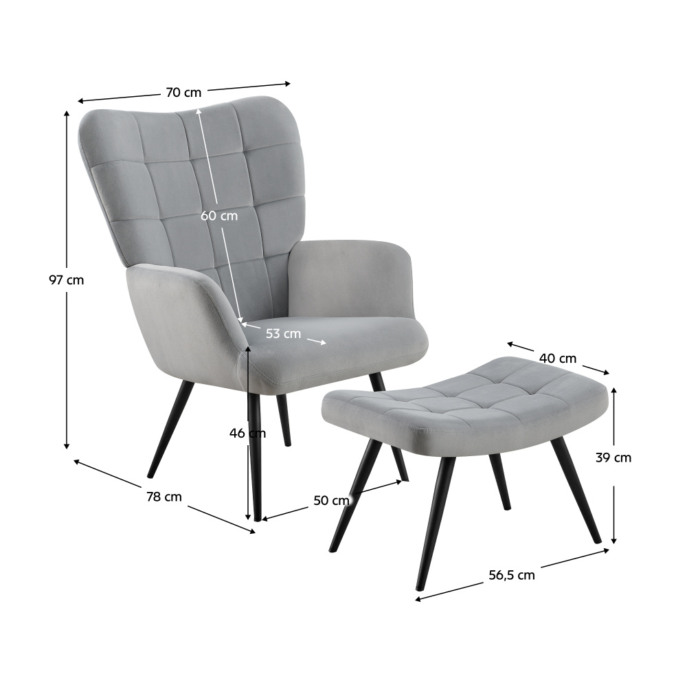 Materiál: látka Velvet 51/kov Oděruodolnost textilie podle testu Martindale: 95 000 oděrů Barevné provedení: šedá/černá Rozměry křesla (ŠxHxV): 70x78x97 cm Výška sedu: 46 cm Hloubka sedu: 53 cm Rozměry podnože (ŠxHxV): 56,5x40x39 cm Nožičky na podnožce jsou výškově nastavitelné Nosnost křesla: 90 kg Nosnost podnože: 80 kg Dodáváno v demontu