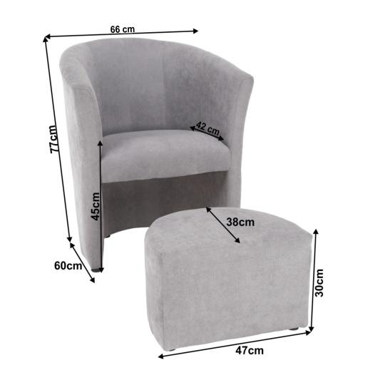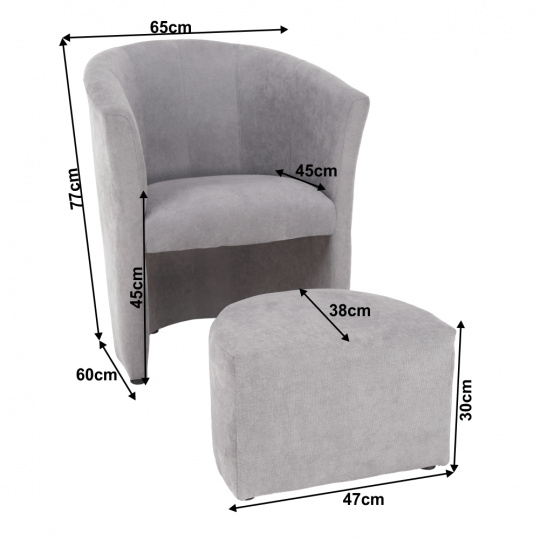 Křeslo s taburetem ROSE Materiál: látka Soro Oděruodolnost textilie podle testu Martindale: 90 000 - 100 000 oděrů Barva: 90 šedá Rozměry křeslo (ŠxVxH): 66x77x60 cm Výška sedu: 45 cm Hloubka sedu: 42 cm Rozměry taburet (ŠxHxV): 47x38x30 cm Hmotnost: 17 kg Nosnost: 120 kg Taburet jako součást celočalouněné Dodávané v demontu. Možnost objednání v látce Soro, Savana, Kronos: 3.950 Kč v látce mikrofáze: 3.690 Kč v ekokůži nebo v látce Lava: 4.050 Kč. Při individuální objednávce je třeba zaplatit 20% zálohu z dané částky. Po uhrazení zálohy bude Vaša objednávka zadána do výroby. Doba dodání 6-8 týdnů.
