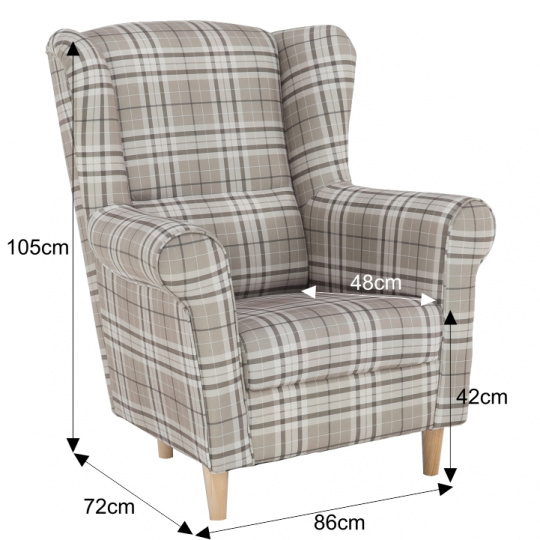 Křeslo-ušák Charlot v barevném provedení látky hnědé káro. Oděruodolnost textilie podle testu Martindale: 85 000 oděrek Dřevěné nožičky v barevném provedení buk. Rozměry (ŠxHxV): 86x82x105 cm Výška sedu: 42 cm Hloubka sedu: 48 cm Nosnost: 120 kg Možnosť objednania v 6 farebných prevedeniach látky alova v cene 7.230 Kč nebo látky Soro v ceně 8.290 Kč. Při individuální objednávce je třeba zaplatit 20% zálohu z dané částky. Po uhrazení zálohy bude Vaša objednávka zadána do výroby. Doba dodání 6-8 týdnů.
