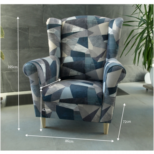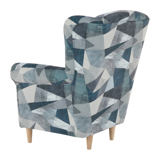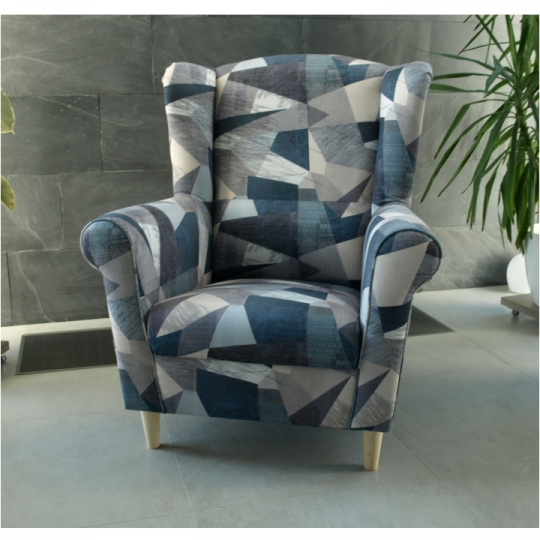 Křeslo ušák, látka šedomodrý vzor, CHARLOT