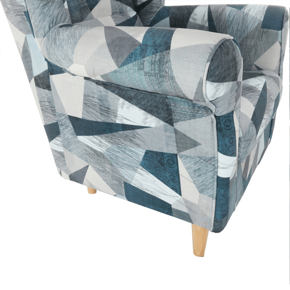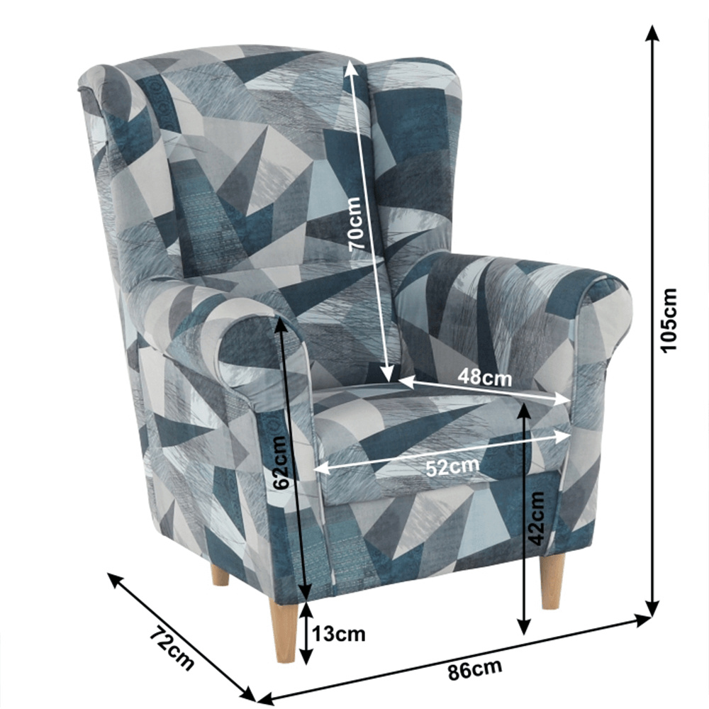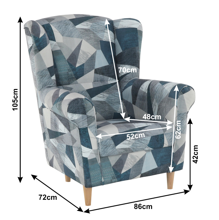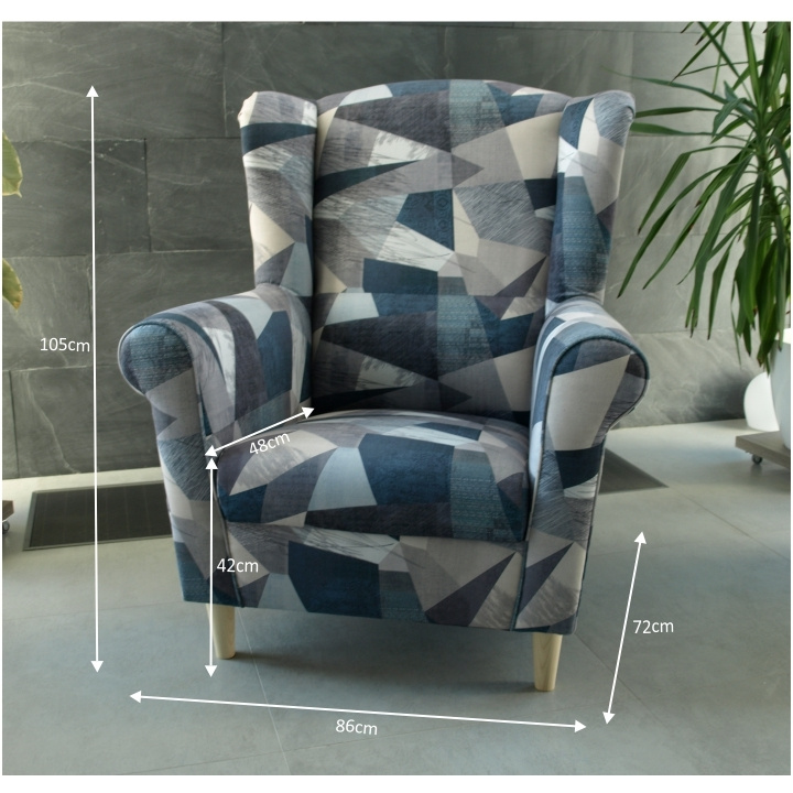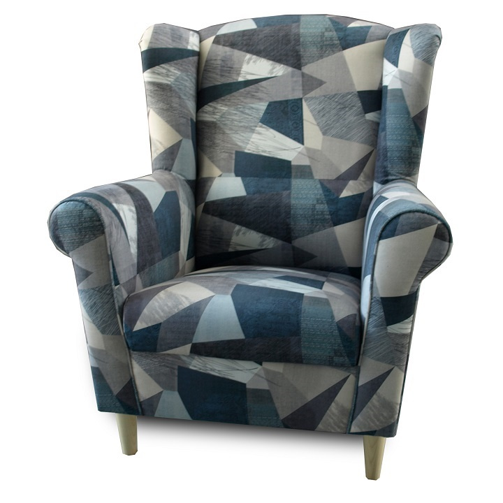 Křeslo-ušák CHARLOT v barevném provedení látky Holm šedomodrý vzor. Oděruodolnost textilie podle testu Martindale: 90 000 oděrek Dřevěné nožičky. Rozměry (ŠxHxV): 86x82x105 cm Výška zádové opěrky: 70 cm Výška područky: 62 cm Nosnost: 120 kg Dodávané v demontu.