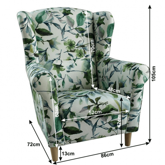 Křeslo-ušák Charlot v barevném provedení látky vzor zelené listí. Oděruodolnost textilie podle testu Martindale: 85 000 oděrek Dřevěné nožičky v barevném provedení buk. Rozměry (ŠxHxV): 86x82x105 cm Výška sedu: 42 cm Hloubka sedu: 48 cm Nosnost: 120 kg Možnosť objednania v 6 farebných prevedeniach látky alova v cene 7.230 Kč nebo látky Soro v ceně 8.290 Kč. Při individuální objednávce je třeba zaplatit 20% zálohu z dané částky. Po uhrazení zálohy bude Vaša objednávka zadána do výroby. Doba dodání 6-8 týdnů.