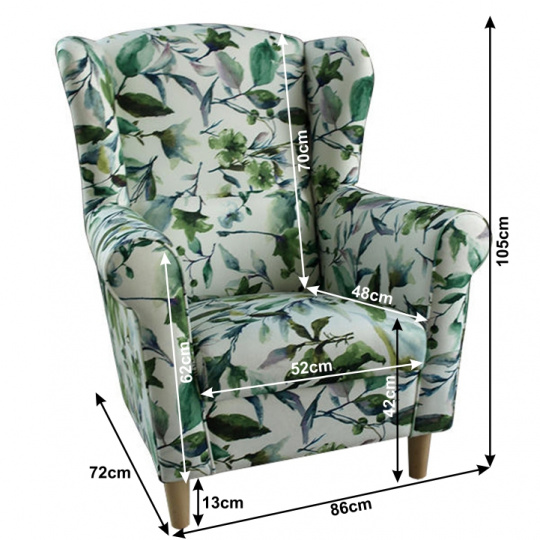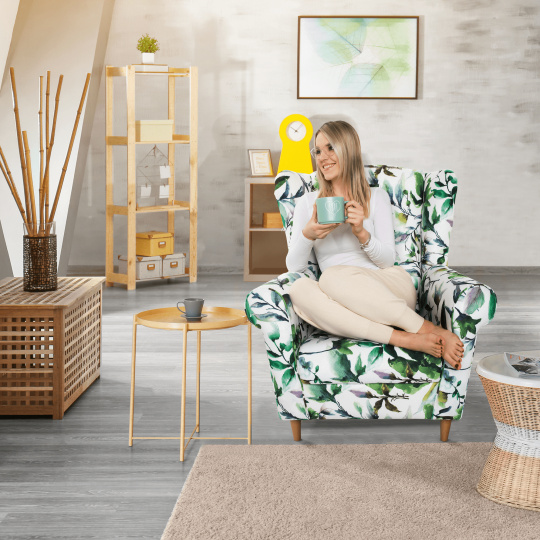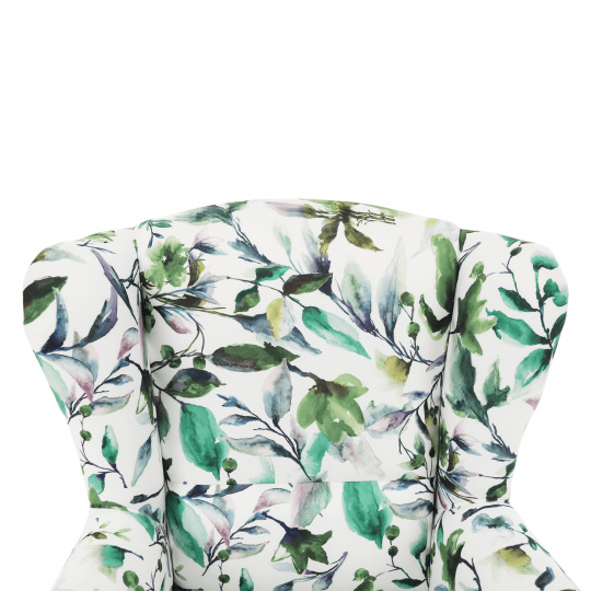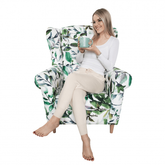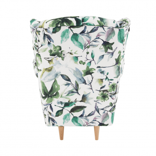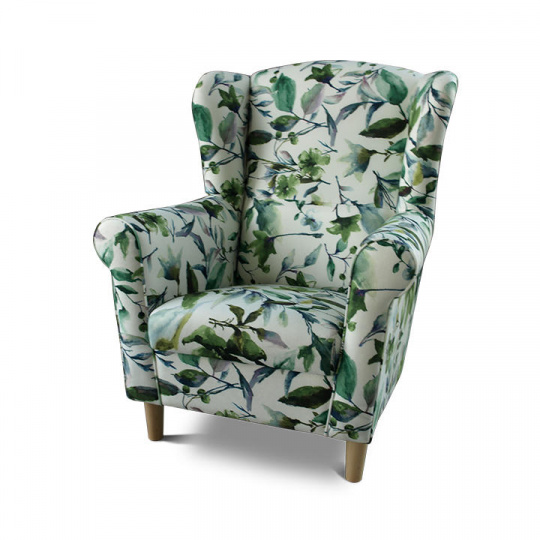 Křeslo ušák, látka vzor listí - nožičky dřevěné, CHARLOT
