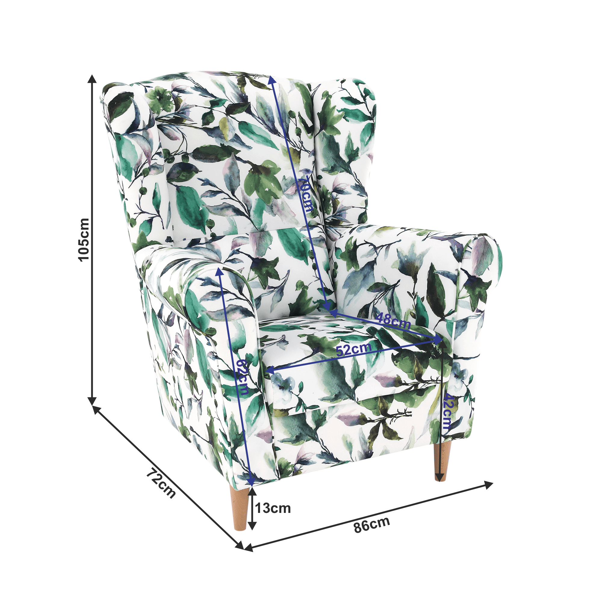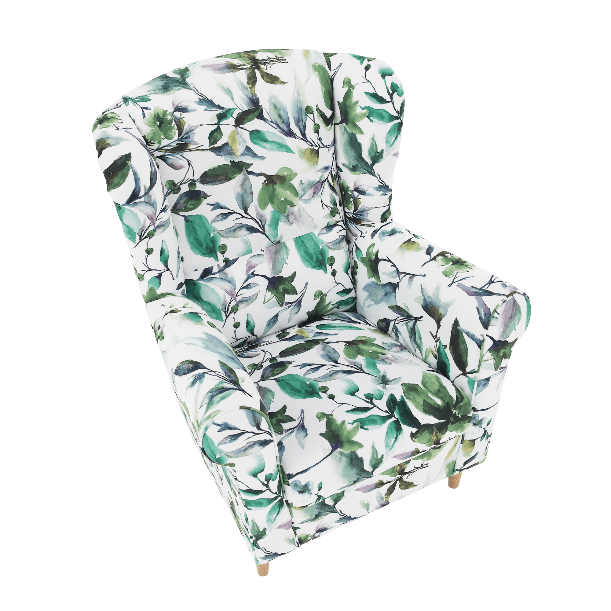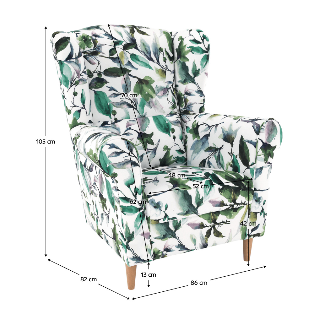Křeslo ušák, látka vzor listí - nožičky dřevěné, CHARLOT