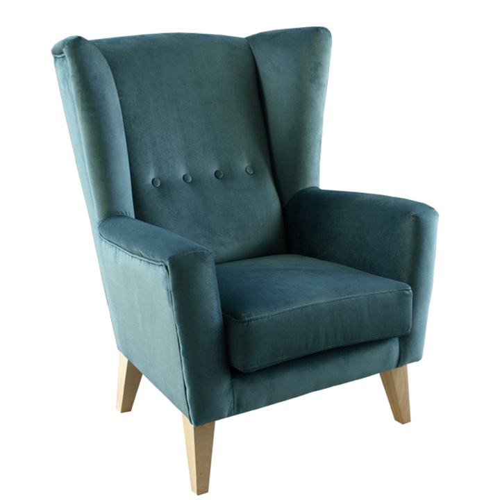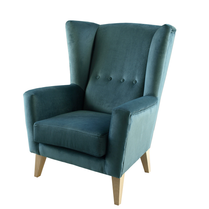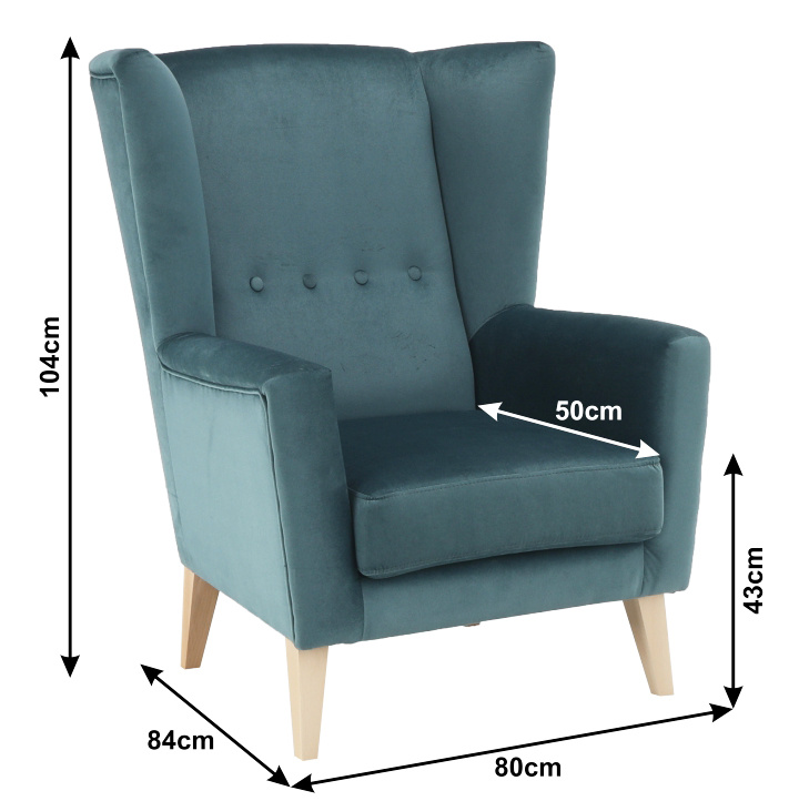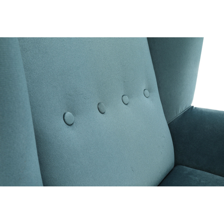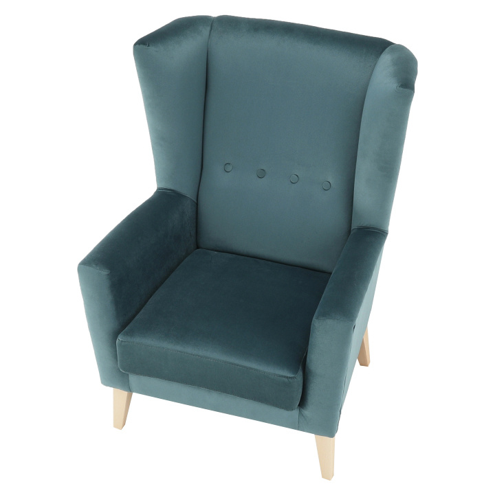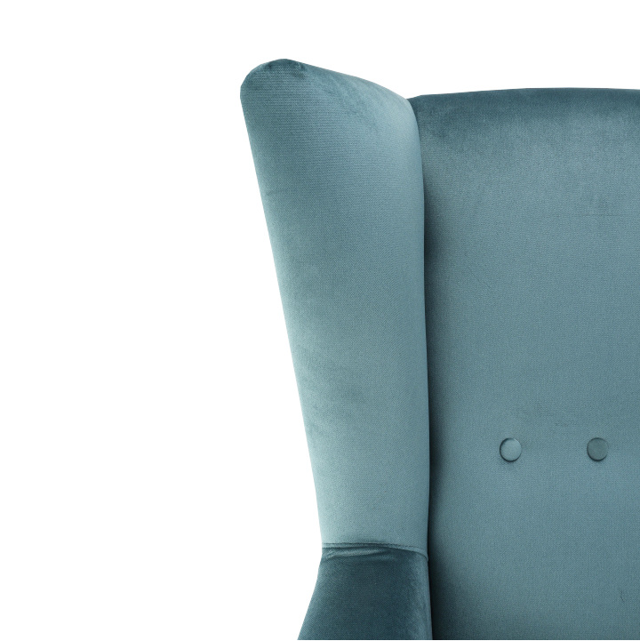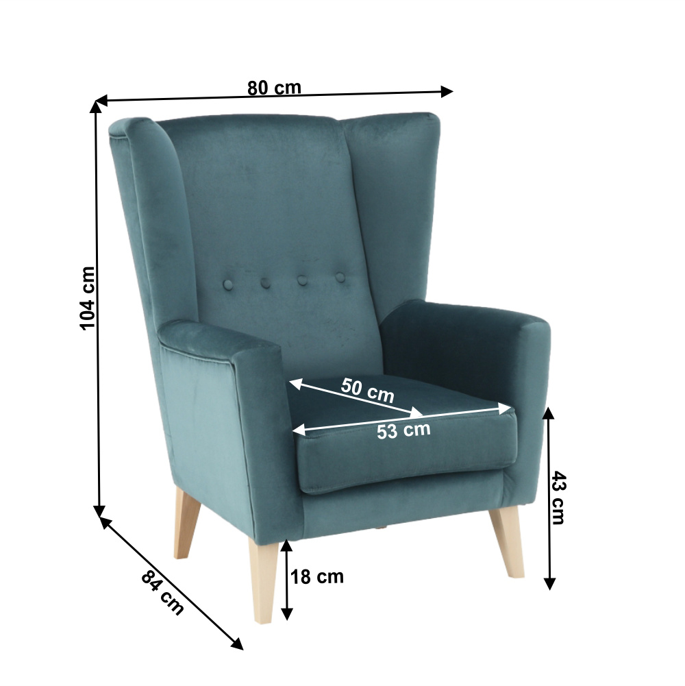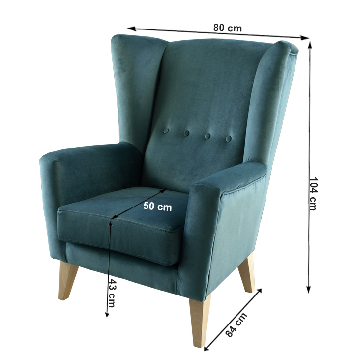 Materiál: látka Kronos 25 / dřevo Oděruodolnost textilie podle testu Martindale: 50 000 oděrek Barva: mentolová / buk Rozměry křesla (ŠxHxV): 80x84x104 cm Výška sedu: 43 cm Hloubka sedu: 50 cm Šířka sedu: 53 cm Výška spodního prostoru od podlahy: 18 cm Nosnost: 120 kg vysoké opěradlo ozdobné knoflíky Dodávané v demontu