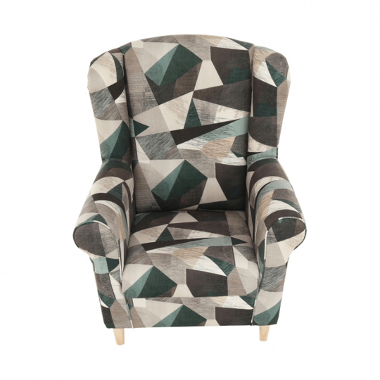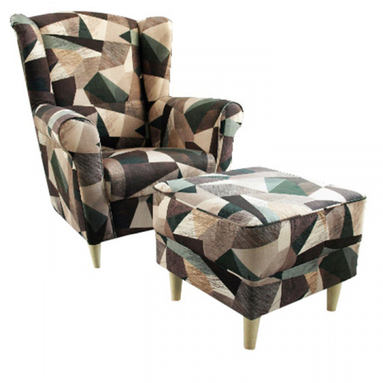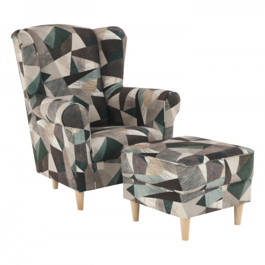 Křeslo ušák, s taburetem, látka hnědozelená vzor, ASTRID