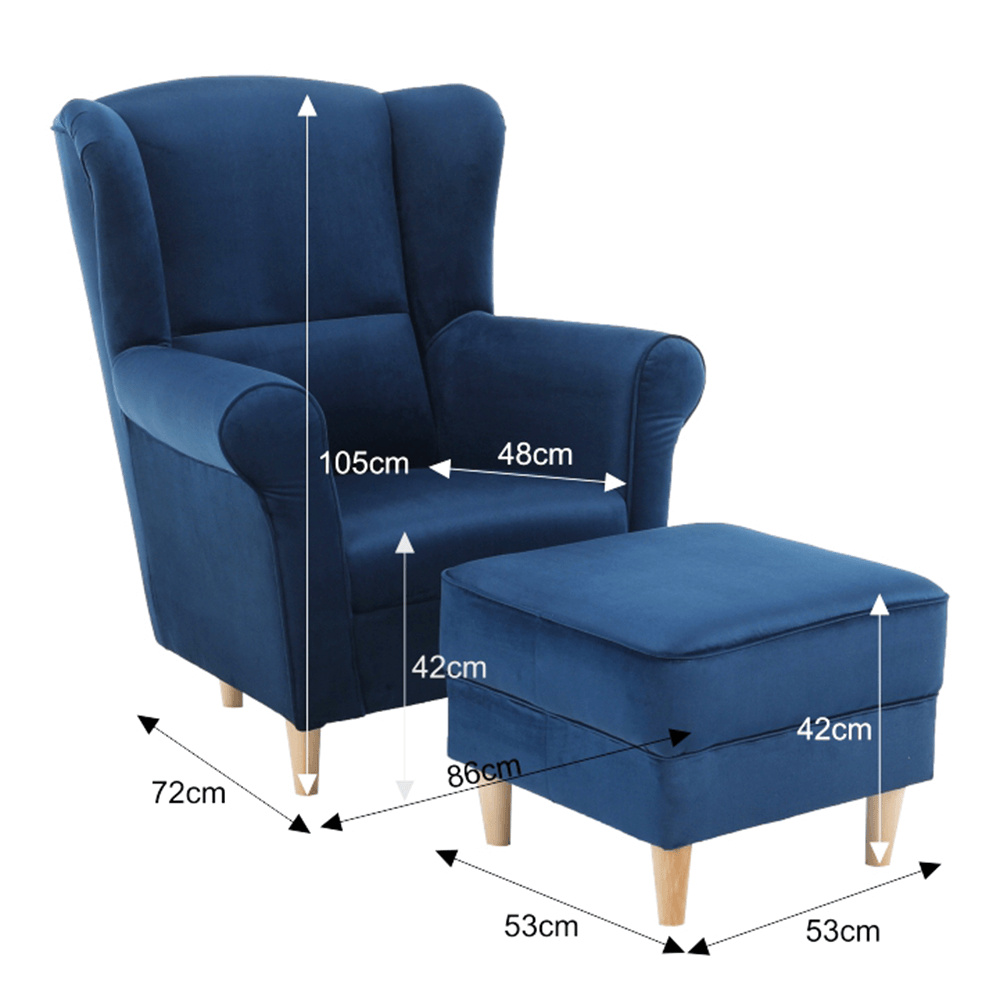 Pohodlné křeslo - ušák s taburetem, provedení: riviera látka modrá- nožičky dřevěné. Oděruodolnost textilie podle testu Martindale: 90 000 oděrek rozměry (ŠxVxH): křeslo - 86x105x82 cm, taburet - 53x42x53 cm, Výška spodního prostoru od podlahy: 13 cm Nosnost křesla: 120 kg Nosnost taburetu: 90 kg Dodávané v demontu. Možnost objednání v 6 barevných provedeních látky alova v ceně 9.790 Kč nebo látky Soro v ceně 10.190 Kč. Při individuální objednávce je třeba zaplatit 20% zálohu z dané částky. Po uhrazení zálohy bude Vaša objednávka zadána do výroby. Doba dodání 6-8 týdnů.
