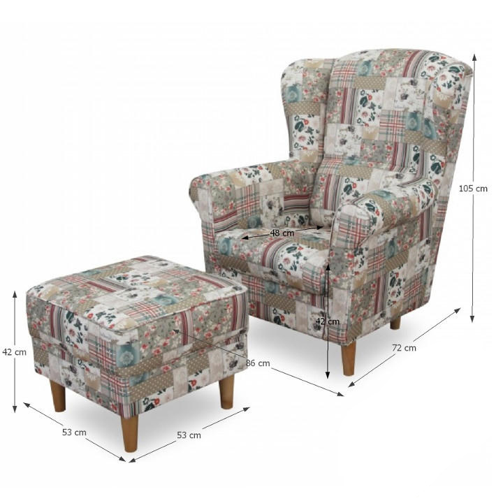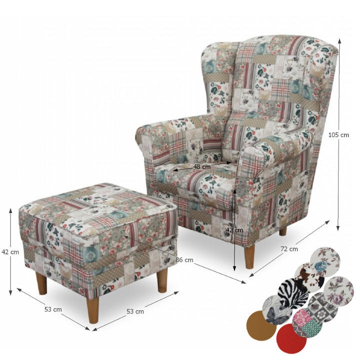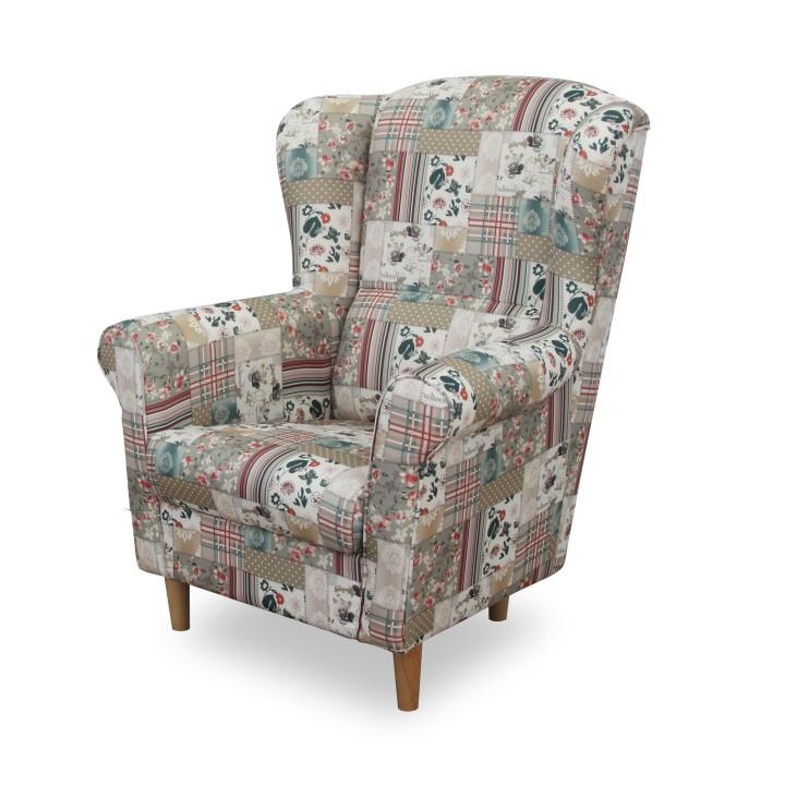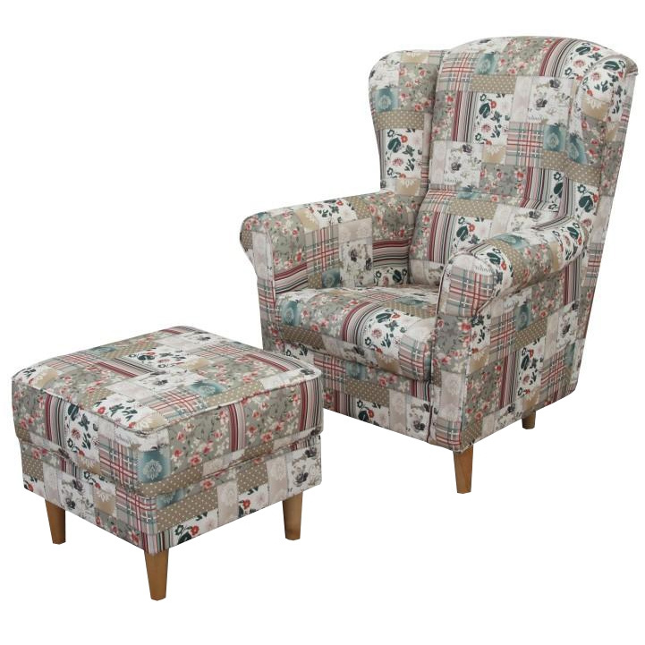 Křeslo ušák s taburetem, látka parchwork Viorica 1, ASTRID