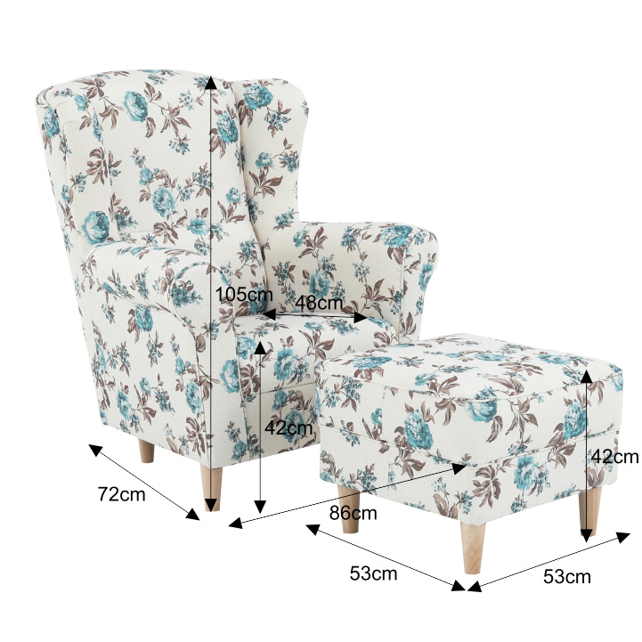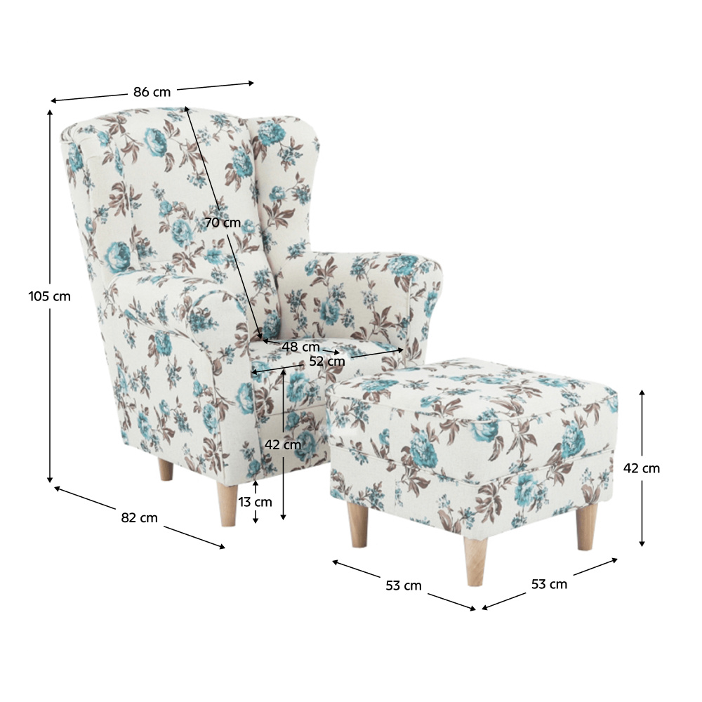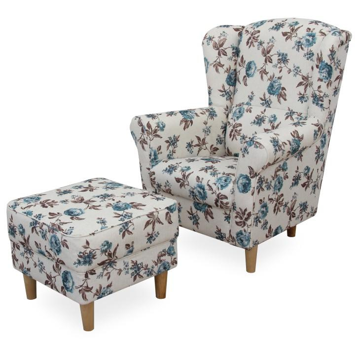 Pohodlné křeslo-ušák s taburetem, provedení: látka Riviera hořčicová 41, smaragdová 38, modrá 81 nebo látka Holm hnědozelená vzor a šedomodrý vzor na skladě - ihned k odběru, rozměry (ŠxHxV): křeslo - 86x82x105 cm, výška a hloubka sedu: 42x48 cm, Výška spodního prostoru od podlahy: 13 cmtaburet - 53x53x42 cm. Oděruodolnost textilie podle