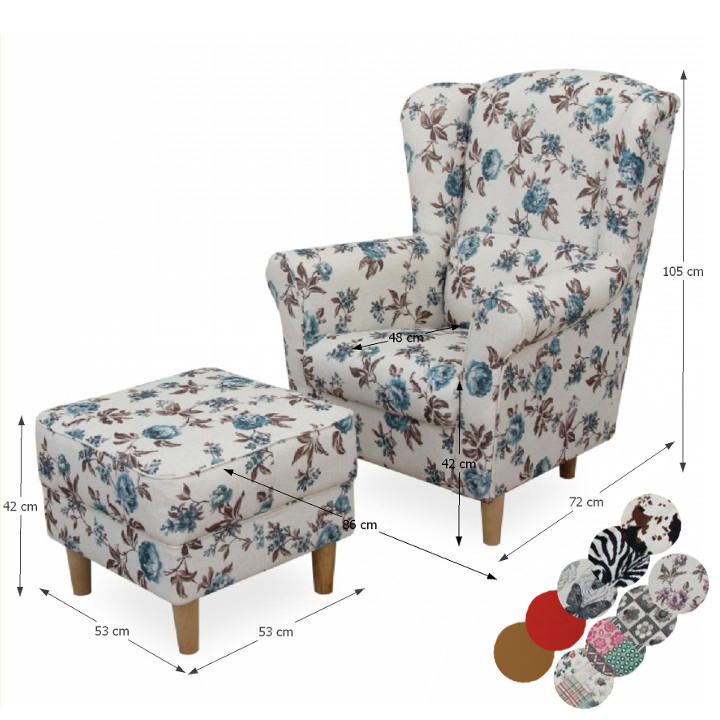 Pohodlné křeslo - ušák s taburetem Provedení: látka patchwork M1 - nožičky dřevěné v barvě buk Oděruodolnost textilie podle testu Martindale: 85 000 oděrek Rozměry (ŠxHxV): křeslo - 86x82x105 cm Taburet - 53x53x42 cm Výška spodního prostoru od podlahy: 13 cm Nosnost křesla: 120 kg Nosnost taburetu: 90 kg Možnost objednání v 6 bare
