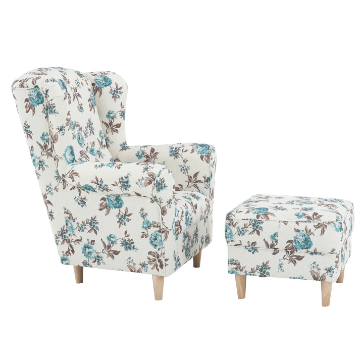 Křeslo ušák, s taburetem, látka modrá, ASTRID
