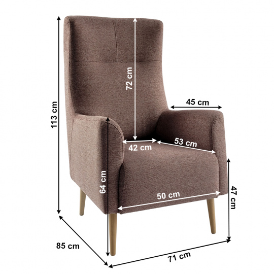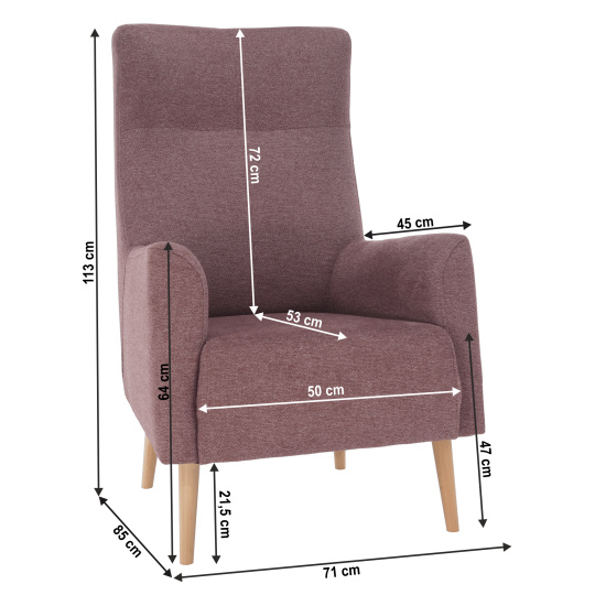 Materiál: látka Matana 14/dřevo Oděruodolnost textilie podle testu Martindale: 57 000 oděrů Barva: starorůžová/buk Rozměry křesla (ŠxHxV): 71x85x113 cm Výška spodního prostoru od podlahy: 21,5 cm Výška sedu: 47 cm Hloubka sedu: 53 cm Výška od země po opěrku na ruce: 64 cm Šířka sedu: 50 cm Výška opěrky zad: 72 cm Hloubka opěrky na ruku: 45 cm Nosnost: 120 kg Celočalouněné Vysoké opěradlo Dodáváno v demontu Křeslo si můžete objednat také v jiné barvě. Na výběr máte čtyři odstíny látky Matana. Odstíny naleznete v přiloženém vzorníku. Výběr barevného odstínu poznamenejte při objednávání přímo do poznámky. Cena křesla v jiném barevném provedení je 6 990 Kč. Při individuální objednávce je třeba zaplatit 20% zálohu z dané částky. Po uhrazení zálohy bude Váš požadavek zadán do výroby. Dodací doba 6-8 týdnů.