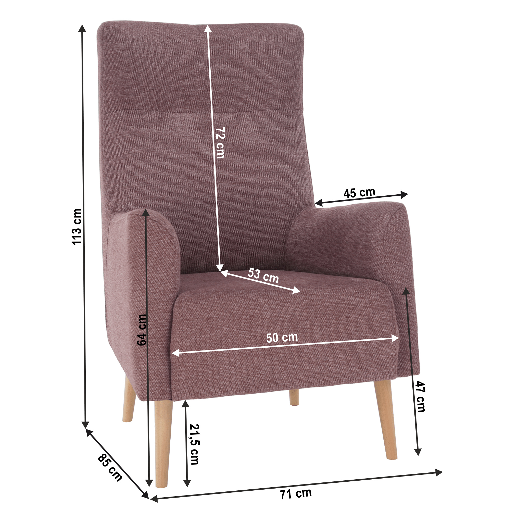Materiál: látka Matana 14/dřevo Oděruodolnost textilie podle testu Martindale: 57 000 oděrů Barva: starorůžová/buk Rozměry křesla (ŠxHxV): 71x85x113 cm Výška spodního prostoru od podlahy: 21,5 cm Výška sedu: 47 cm Hloubka sedu: 53 cm Výška od země po opěrku na ruce: 64 cm Šířka sedu: 50 cm Výška opěrky zad: 72 cm Hloubka opěrky na ruku: 45 cm Nosnost: 120 kg Celočalouněné Vysoké opěradlo Dodáváno v demontu Křeslo si můžete objednat také v jiné barvě. Na výběr máte čtyři odstíny látky Matana. Odstíny naleznete v přiloženém vzorníku. Výběr barevného odstínu poznamenejte při objednávání přímo do poznámky. Cena křesla v jiném barevném provedení je 6 990 Kč. Při individuální objednávce je třeba zaplatit 20% zálohu z dané částky. Po uhrazení zálohy bude Váš požadavek zadán do výroby. Dodací doba 6-8 týdnů.