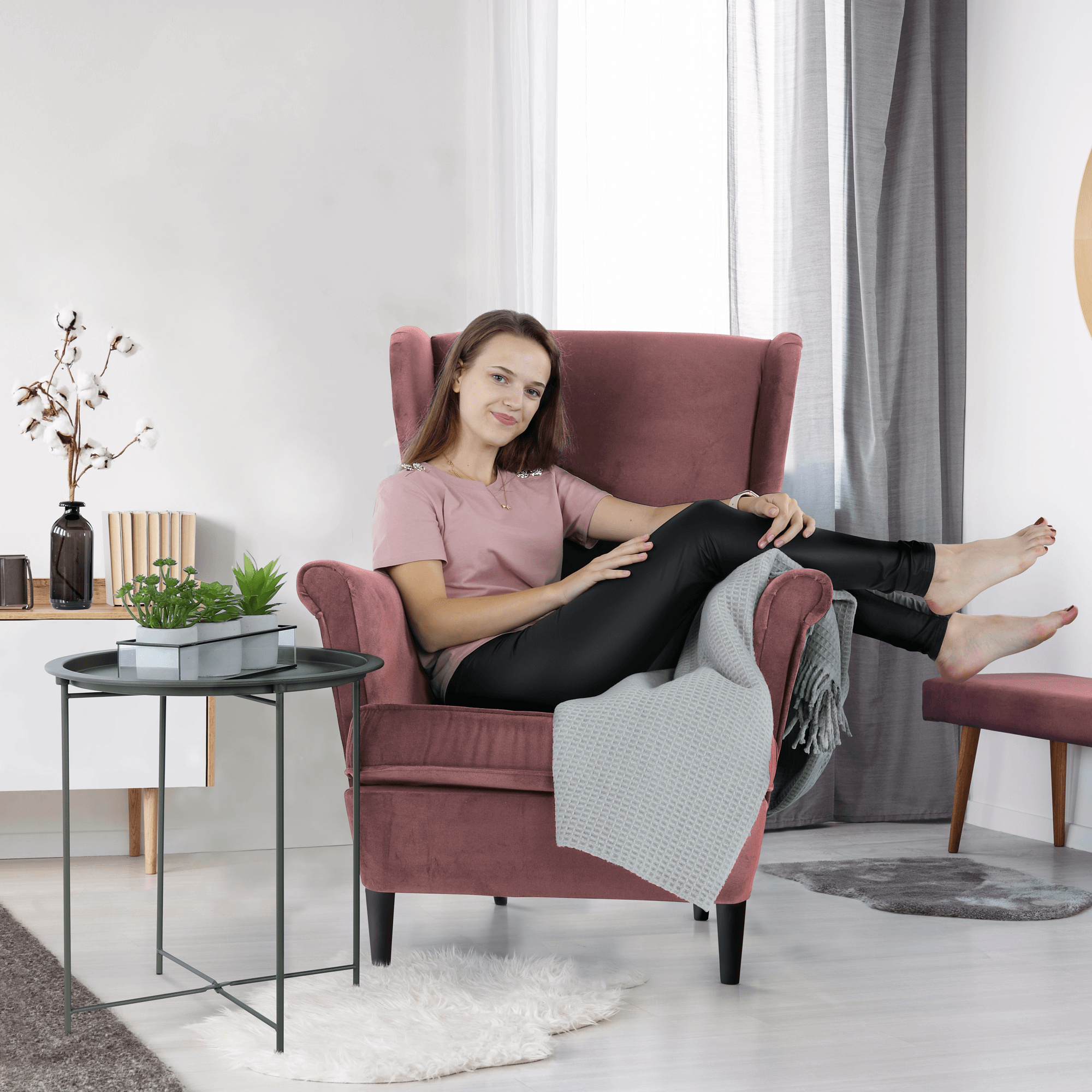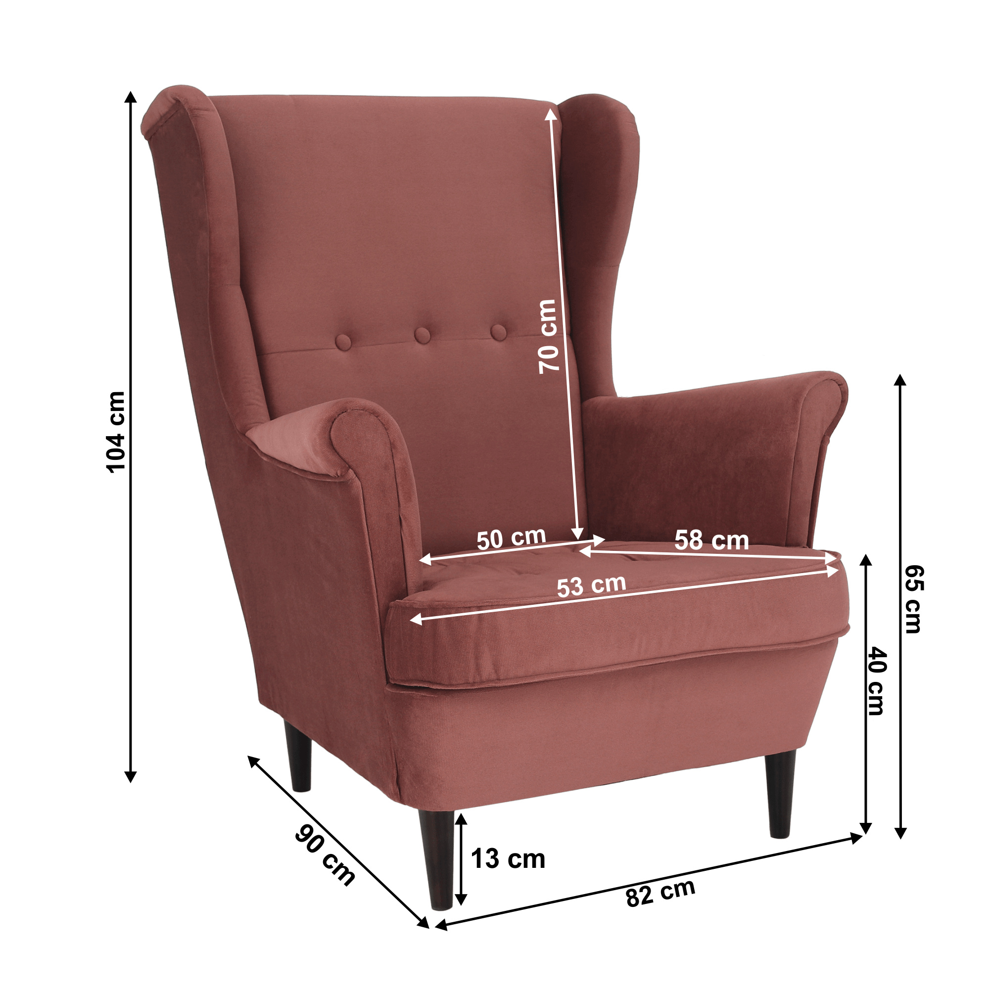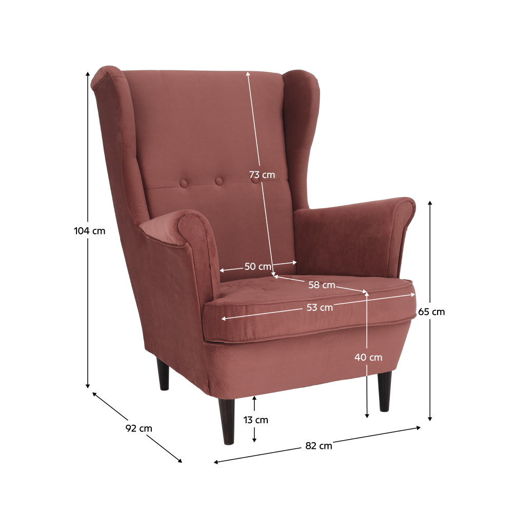Materiál čalounění: látka Kronos Oděruodolnost textilie podle testu Martindale: 50 000 oděrů Barva čalounění: starorůžová 29 Materiál nohy: dřevo Barva nohy: ořech Rozměry křesla (ŠxHxV): 82x92x104 cm Výška sedu: 40 cm Hloubka sedu: 58 cm Výška spodního prostoru od podlahy: 13 cm Šířka sedáku: 53 cm Výška zádové opěrky: 73 cm Výška od země po opěrku: 65 cm Nosnost: 120 kg Dřevěné nožičky Barva nožiček se může lišit Dodáváno v demontu