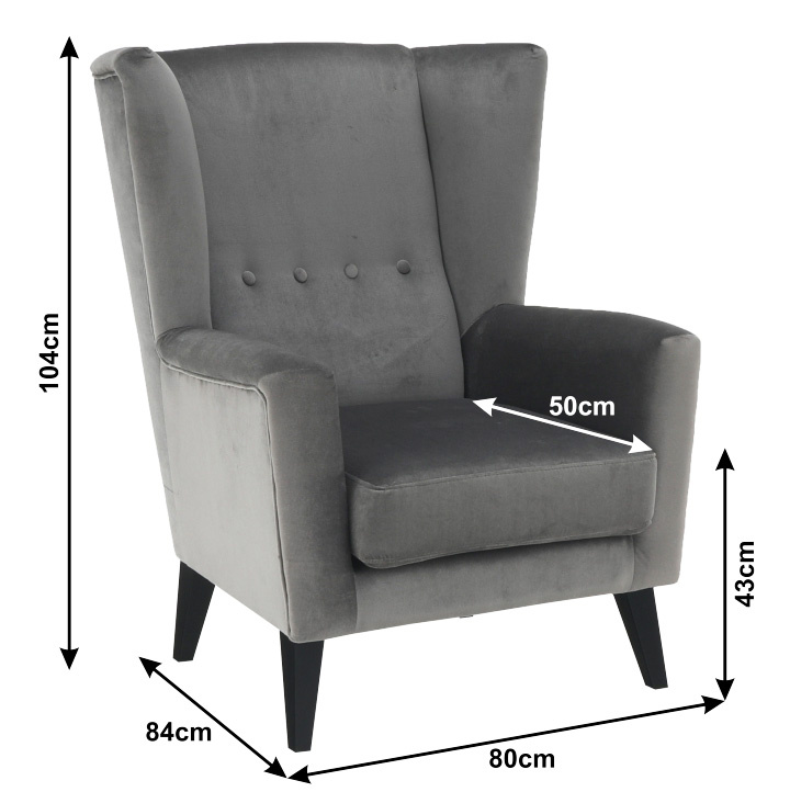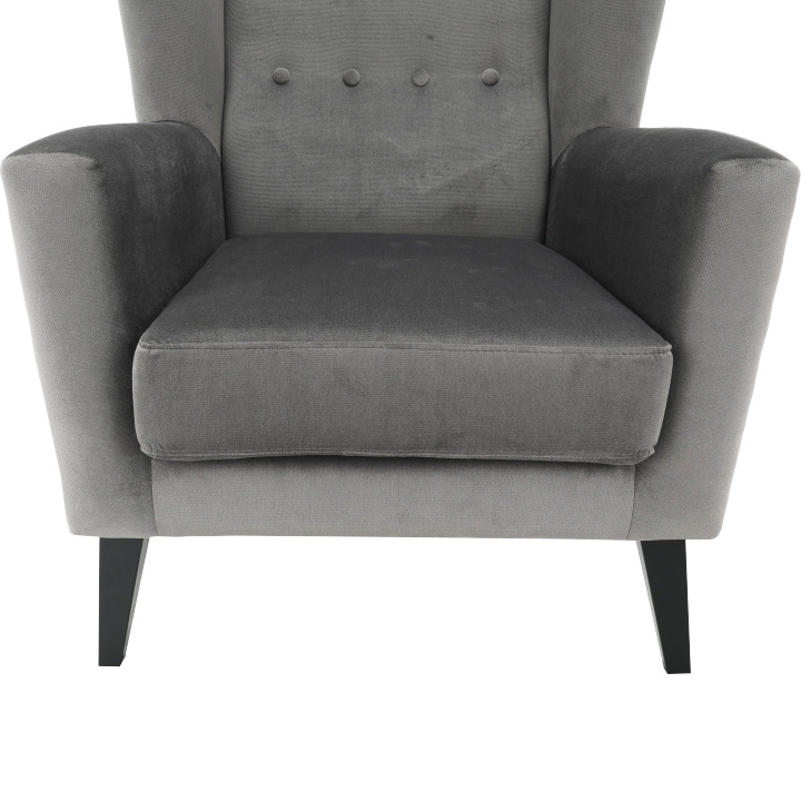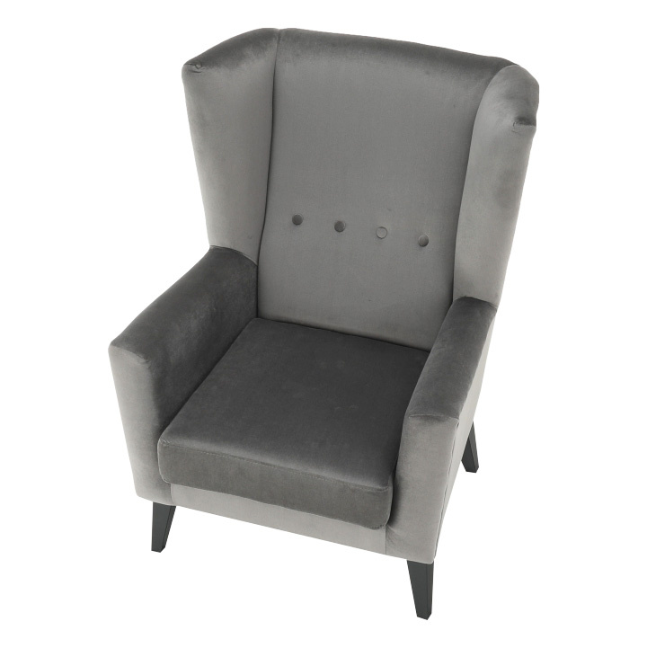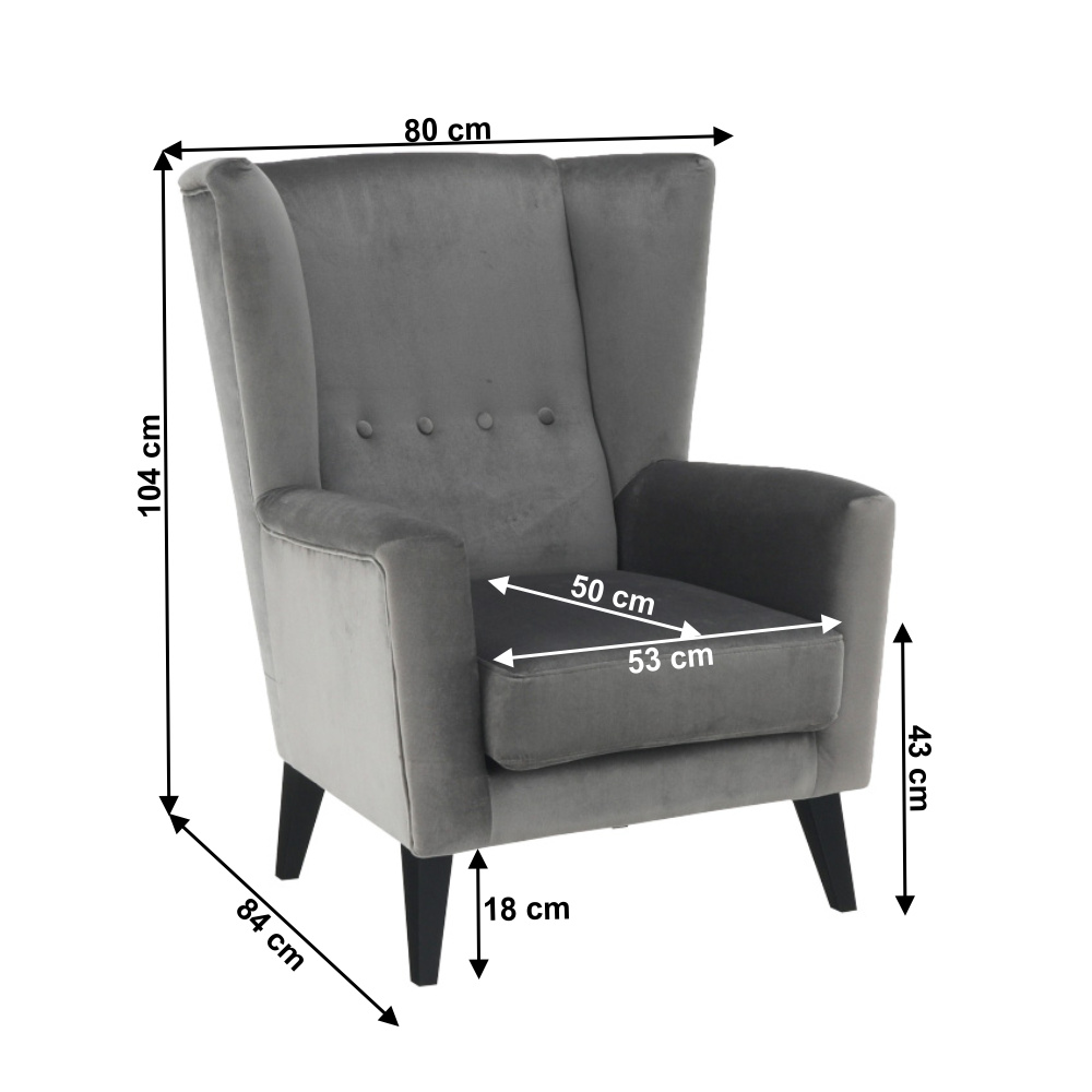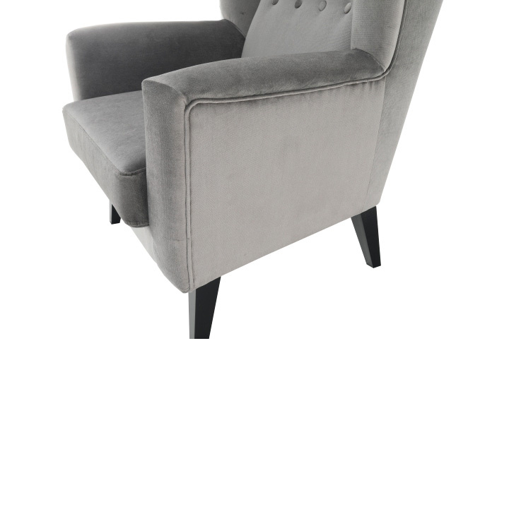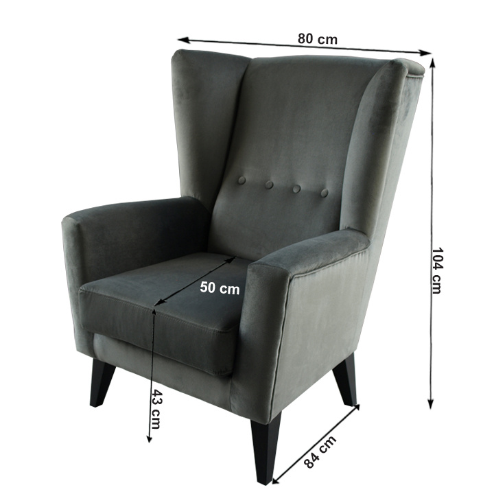 Materiál: látka Kronos 15 / dřevo Oděruodolnost textilie podle testu Martindale: 50 000 oděrek Barva: světlešedá / černá Rozměry křesla (ŠxHxV): 80x84x104 cm Výška sedu: 43 cm Hloubka sedu: 50 cm Šířka sedu: 53 cm Výška spodního prostoru od podlahy: 18 cm Nosnost: 120 kg vysoké opěradlo ozdobné knoflíky Dodávané v demontu