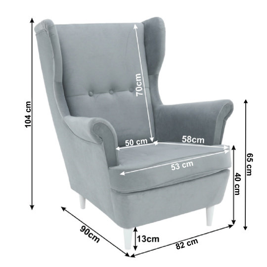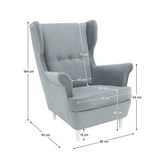 Materiál čalounění: látka Trinity Oděruodolnost textilie podle testu Martindale: 55 000 oděrů Barva čalounění: světle šedá 14 Materiál nohy: dřevo Barva nohy: bílá Rozměry křesla (ŠxHxV): 82x92x104 cm Výška sedu: 40 cm Hloubka sedu: 58 cm Výška spodního prostoru od podlahy: 13 cm Šířka sedáku: 53 cm Výška zádové opěrky: 73 cm Výška od země po opěrku: 65 cm Nosnost: 120 kg Dřevěné nožičky Dodáváno v demontu