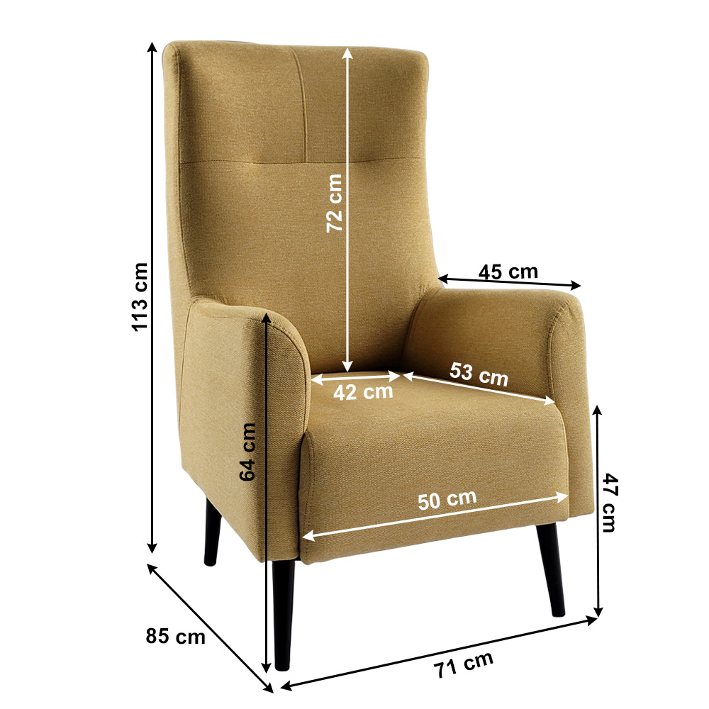 Materiál: látka Matana 09/dřevo Oděruodolnost textilie podle testu Martindale: 57 000 oděrů Barva: žlutá/černá Rozměry křesla (ŠxHxV): 70x82x113 cm Výška spodního prostoru od podlahy: 21,5 cm Výška sedu: 46 cm Hloubka sedu: 53 cm Šířka sedu: 50 cm Výška od země po opěrku na ruce: 64 cm Výška opěrky zad: 72 cm Hloubka opěrky na ruku: 45 cm Nosnost: 120 kg Celočalouněné Vysoké opěradlo Dodáváno v demontu Křeslo si můžete objednat také v jiné barvě. Na výběr máte čtyři odstíny látky Matana. Odstíny naleznete v přiloženém vzorníku. Výběr barevného odstínu poznamenejte při objednávání přímo do poznámky. Při individuální objednávce je třeba zaplatit 20% zálohu z dané částky. Po uhrazení zálohy bude Váš požadavek zadán do výroby. Dodací doba 6-8 týdnů.
