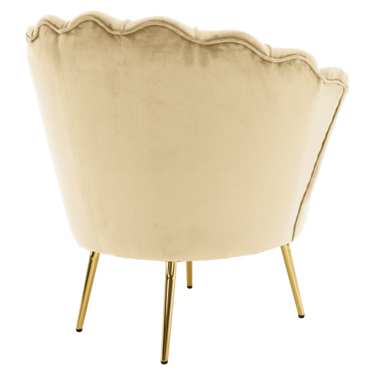 Materiál: látka Velvet/kov Oděruodolnost textilie podle testu Martindale: 80 000 oděrů Barva: béžová/gold chrom zlatý Rozměry (ŠxHxV): 76x68x77 cm Výška sedu: 43 cm Hloubka sedu: 46 cm Šířka sedu: 46 cm Výška zádové opěrky: 34 cm Šířka zádové opěrky: 73 cm Nosnost: 100 kg Hmotnost: 11 kg Výplň: pěna Designové Ve stylu Art-deco Ve tvaru mušle Celočalouněné Dekorativní prošívání Dodáváno v monte