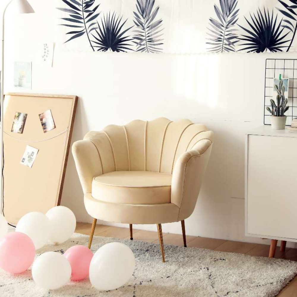 Materiál: látka Velvet/kov Oděruodolnost textilie podle testu Martindale: 80 000 oděrů Barva: béžová/gold chrom zlatý Rozměry (ŠxHxV): 76x68x77 cm Výška sedu: 43 cm Hloubka sedu: 46 cm Šířka sedu: 46 cm Výška zádové opěrky: 34 cm Šířka zádové opěrky: 73 cm Nosnost: 100 kg Hmotnost: 11 kg Výplň: pěna Designové Ve stylu Art-deco Ve tvaru mušle Celočalouněné Dekorativní prošívání Dodáváno v monte