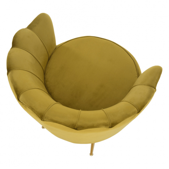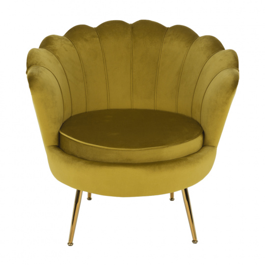 Materiál sedáku: látka Velvet Oděruodolnost textilie podle testu Martindale: 80 000 oděrů Barva: hořčicová Materiál nohy: kov Barva: gold chrom-zlatý Rozměry (ŠxHxV): 76x78x78 cm Výška sedu: 42 cm Hloubka sedu: 56 cm Nosnost: 90 kg Nohy zakončené ohebnými kluzáky pro vyrovnání nerovnosti povrchu Designové Ve stylu Art-deco Ve tvaru mušle Moderně zpracované Dodáváno v demontu