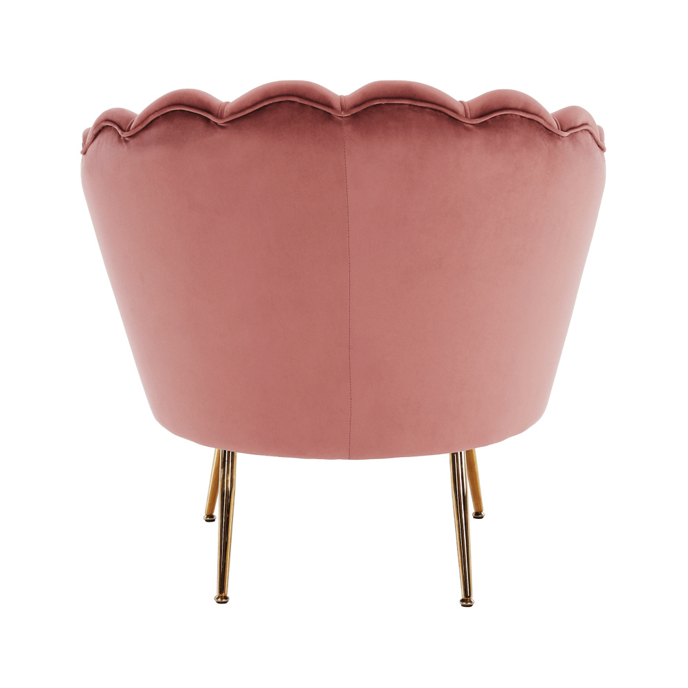 Materiál sedáku: látka Velvet Oděruodolnost textilie podle testu Martindale: 80 000 oděrů Barva: růžová Materiál nohy: kov Barva: gold chrom-zlatý Rozměry (ŠxHxV): 76x78x78 cm Výška sedu: 42 cm Hloubka sedu: 56 cm Nosnost: 90 kg Nohy zakončené ohebnými kluzáky pro vyrovnání nerovnosti povrchu Designové Ve stylu Art-deco Ve tvaru mušle Moderně zpracované Dodáváno v demontu