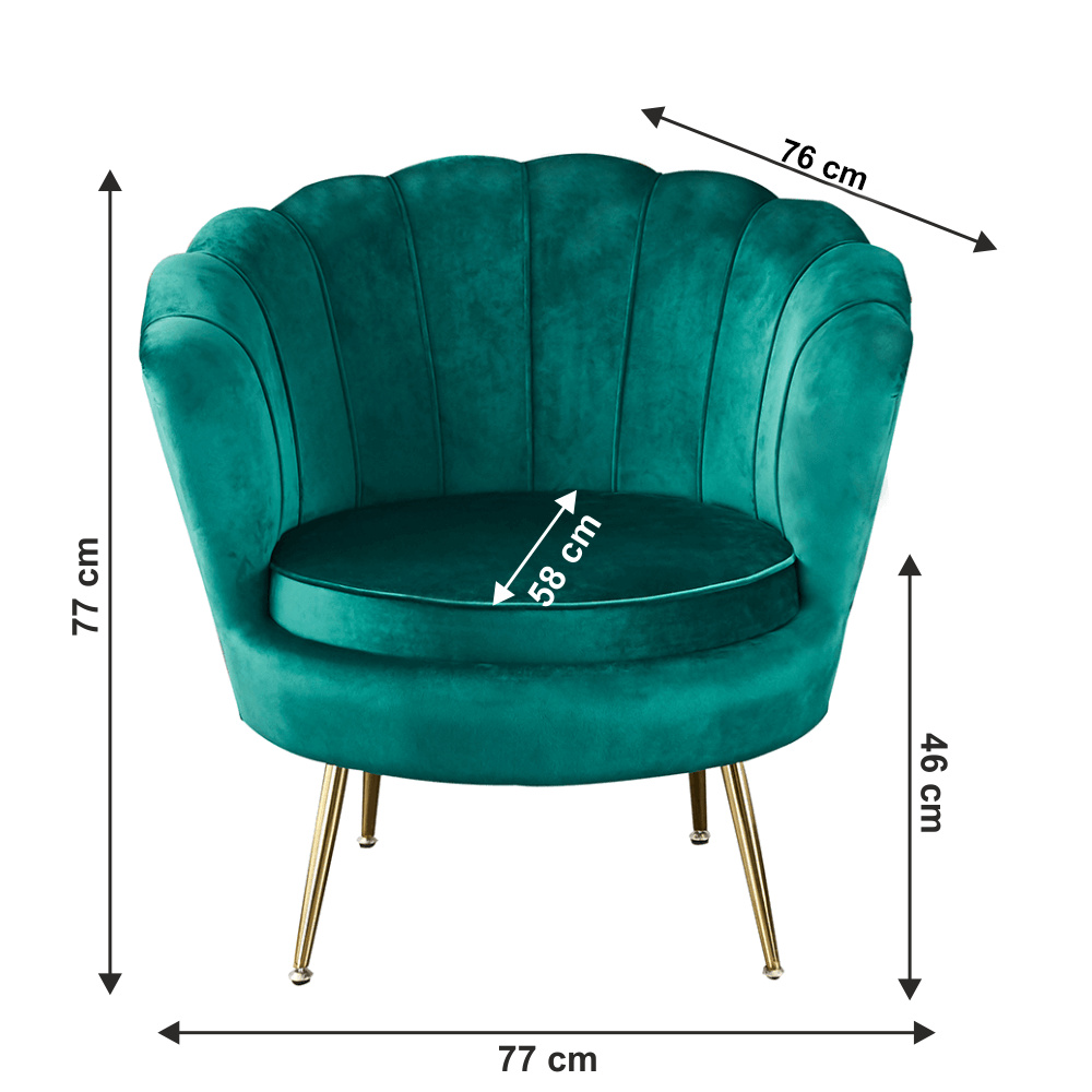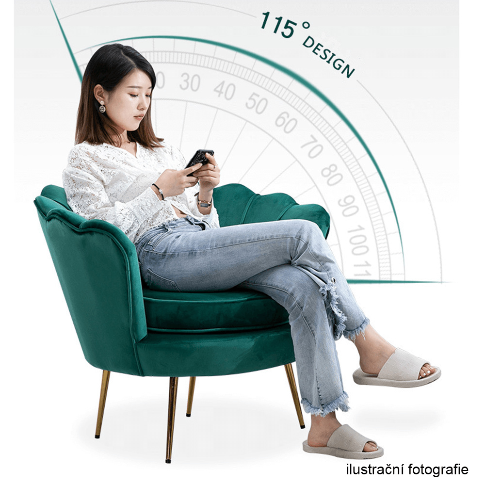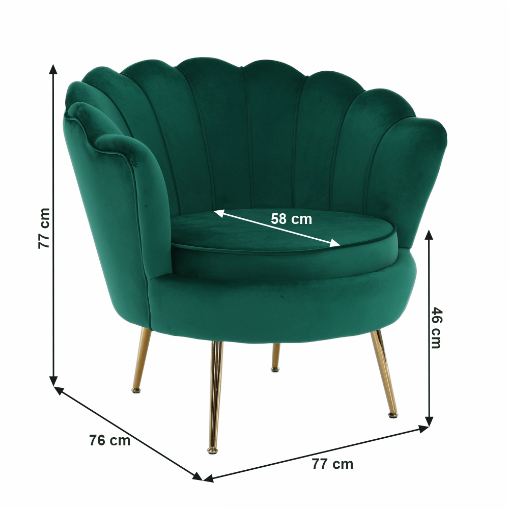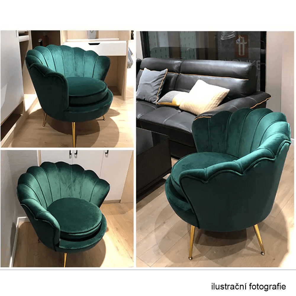 Materiál sedáku: látka Velvet Oděruodolnost textilie podle testu Martindale: 80 000 oděrů Barva: smaragdová Materiál nohy: kov Barva: gold chrom-zlatý Rozměry (ŠxHxV): 76x78x78 cm Výška sedu: 42 cm Hloubka sedu: 56 cm Nosnost: 90 kg Nohy zakončené ohebnými kluzáky pro vyrovnání nerovnosti povrchu Designové Ve stylu Art-deco Ve tvaru mušle Moderně zpracované Dodáváno v demontu