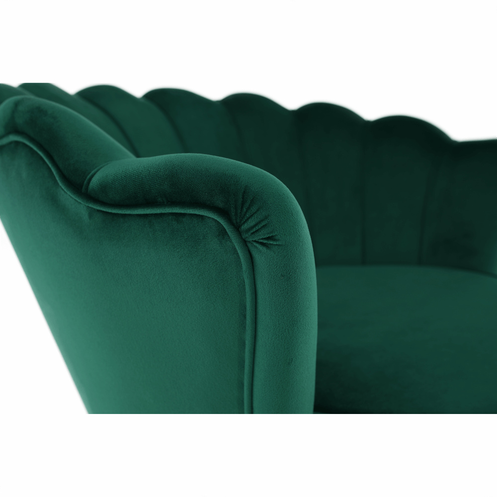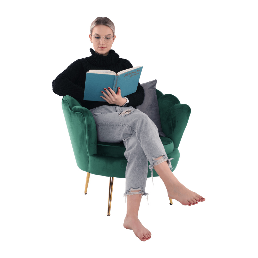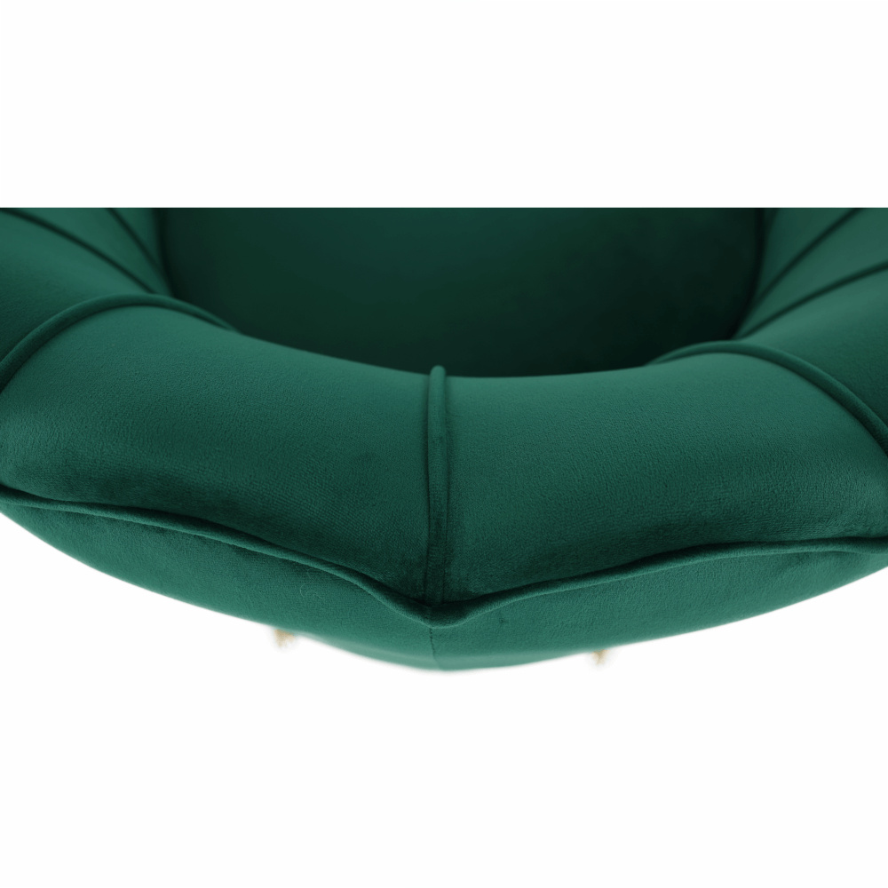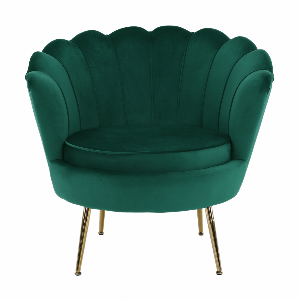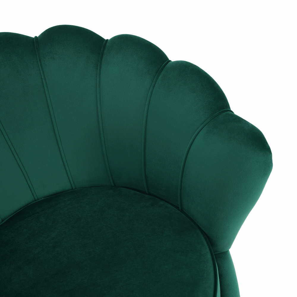 Materiál sedáku: látka Velvet Oděruodolnost textilie podle testu Martindale: 80 000 oděrů Barva: smaragdová Materiál nohy: kov Barva: gold chrom-zlatý Rozměry (ŠxHxV): 76x78x78 cm Výška sedu: 42 cm Hloubka sedu: 56 cm Nosnost: 90 kg Nohy zakončené ohebnými kluzáky pro vyrovnání nerovnosti povrchu Designové Ve stylu Art-deco Ve tvaru mušle Moderně zpracované Dodáváno v demontu