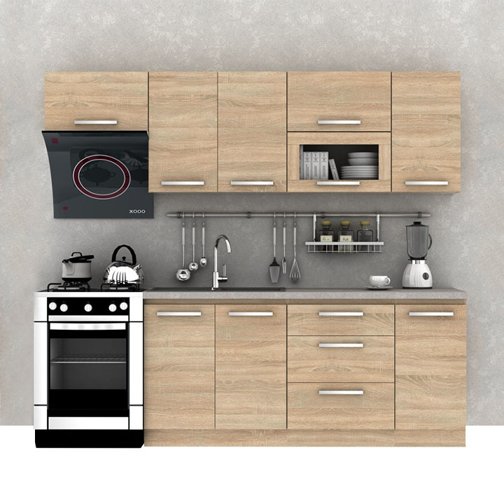 Kuchyňská sestava 2,4 m NOVA PLUS Materiál: DTD laminovaná Barva: dub sonoma Horní rozměr kuchyňské sestavy je 2,4m. Spodní rozměr kuchyňské sestavy je 1,8 m. Kvalitní slovenský výrobek. Dodávané v demontu. Cena za pracovní desku je 1.590, - Kč za bm - tloušťka 38 mm. Horní rozměr kuchyňské sestavy je 2,4 m, spodní rozměr je 1,8 m. Tloušťka materiálu: 16 mm Základní kuchyňská sestava a všechny spodní skříňky jsou dodávány bez pracovní desky, včetně dolní lišty. Možnost dokoupit univerzální L / P dřez LAY ON.