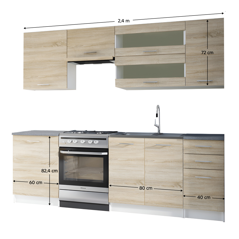 Kuchyňská sestava FABIANA Materiál: DTD laminovaná Barva: bílá/dub sonoma Rozměry (ŠxHxV): 240x46x154,4 cm Spodní část bez sporáku 180 cm Levá spodní skříňka (ŠxHxV): 60x46x82,4 cm Dvoudveřová spodní skříňka (ŠxHxV): 80x46x82,4 cm Spodní šuplíková skříňka (ŠxHvV): 40x46x82,4 cm Horní část 240 cm Jednodveřová horní skříňka sleva (ŠxHxV): 6