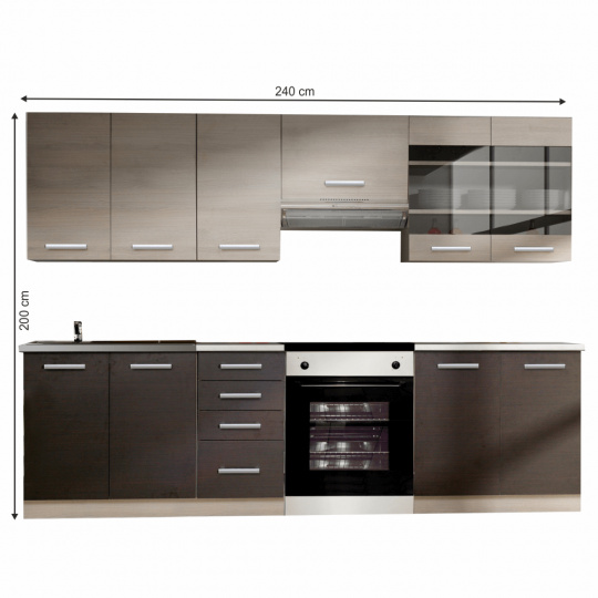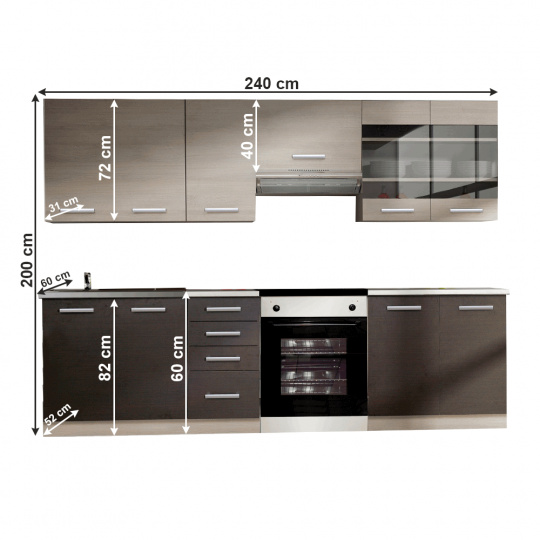 Výška horních skříněk: 72 cm, Výška digestořovou skříňky: 40 cm Výška dolních skříněk bez pracovní desky: 82 cm Hloubka horních skříněk: 31 cm Hloubka spodních skříněk bez pracovní desky: 52 cm Hloubka spodních skříněk s pracovní deskou: 60 cm Dřezová skříňka dodávána bez pracovní desky. Možnost dokoupení univerzálního L/P dřezu LAY ON.