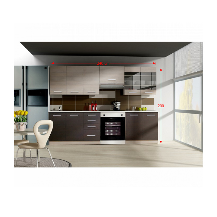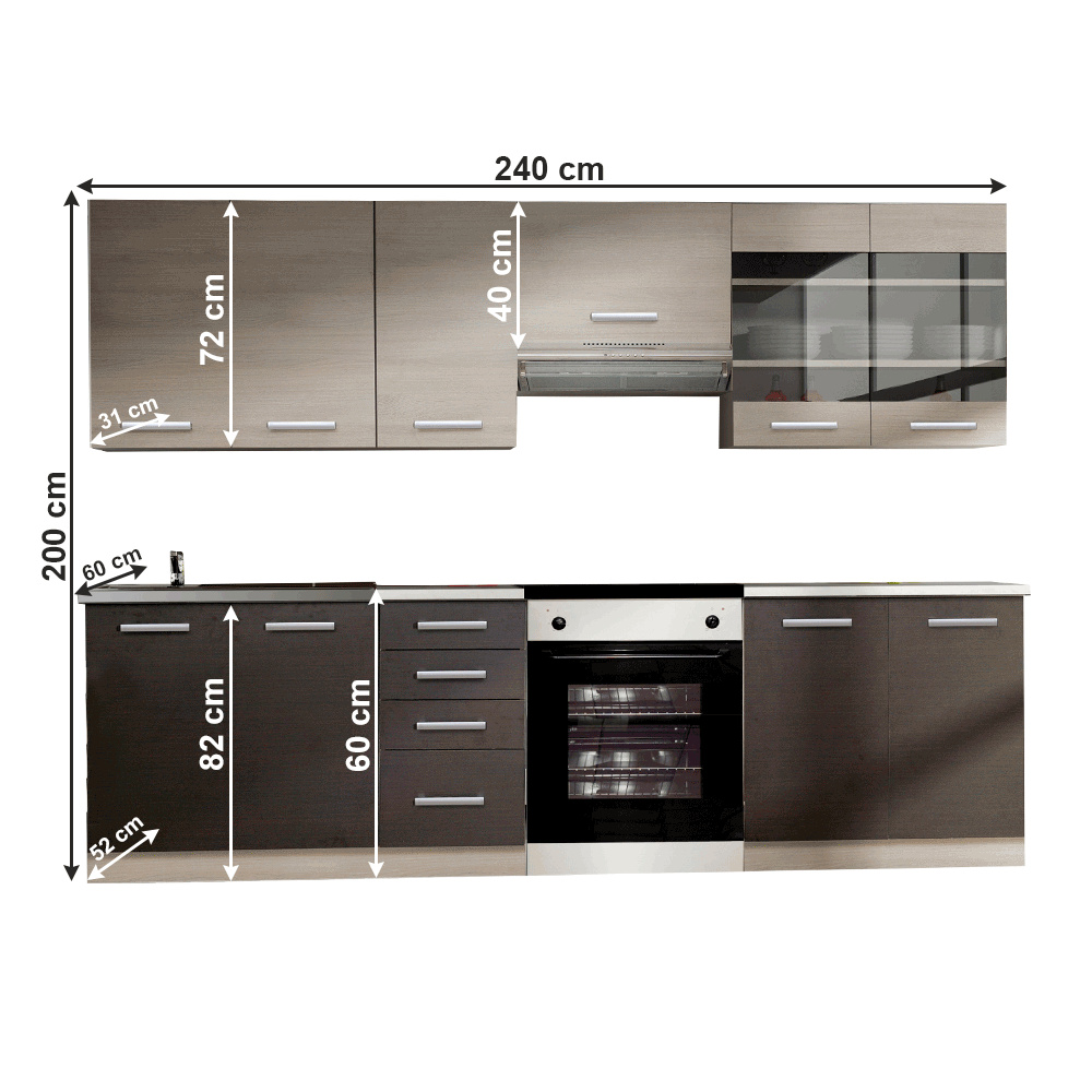 Výška horních skříněk: 72 cm, Výška digestořovou skříňky: 40 cm Výška dolních skříněk bez pracovní desky: 82 cm Hloubka horních skříněk: 31 cm Hloubka spodních skříněk bez pracovní desky: 52 cm Hloubka spodních skříněk s pracovní deskou: 60 cm Dřezová skříňka dodávána bez pracovní desky. Možnost dokoupení univerzálního L/P dřezu LAY ON.