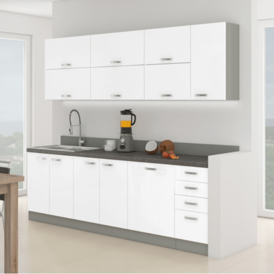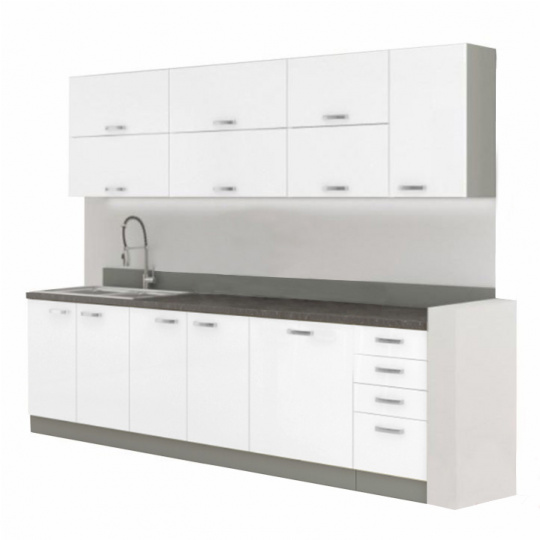 Kuchyňská linka PRADO Materiál: Barva: bílá extra vysoký lesk, korpus: šedý Šířka horní a spodní sestavy: 2,6 m Spodní skříňky (VxH): 86x52 cm Horní skříňky (ŠxHxV): 80/60/40x31x71 cm Včetně pracovní desky, rozměr 2,6 m Systém tichého dorazu zásuvek Systém tichého zavírání dvířek Bez dřezu Tloušťka pracovní desky metalic brown: 28 mm Dodáváno bez dekorací a spotřebičů Dodáváno v demontu tloušťka pracovní desky 28 mm, horní i dolní rozměr 2,6 m, dolní skříňky ZZ jsou dodávány včetně pracovní desky a dolní lišty, dřezová skříňka bez pracovní desky. Sektorové skrinky sú dodávané bez pracovnej dosky vrátane spodnej lišty.Možnosť dokúpiť PD metalic brown v cene 1.650 Kč/1m. K našim kuchyňským skříňkám si můžete objednat i dřezy, baterie a příslušenství.